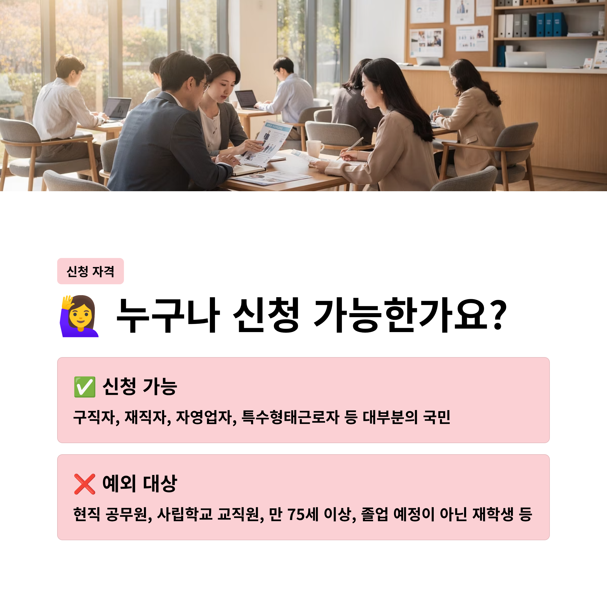 기본적으로 대한민국 국민이라면 누구나 신청 가능하지만, 국가 예산으로 운영되는 만큼 일부 제외 대상이 존재합니다.