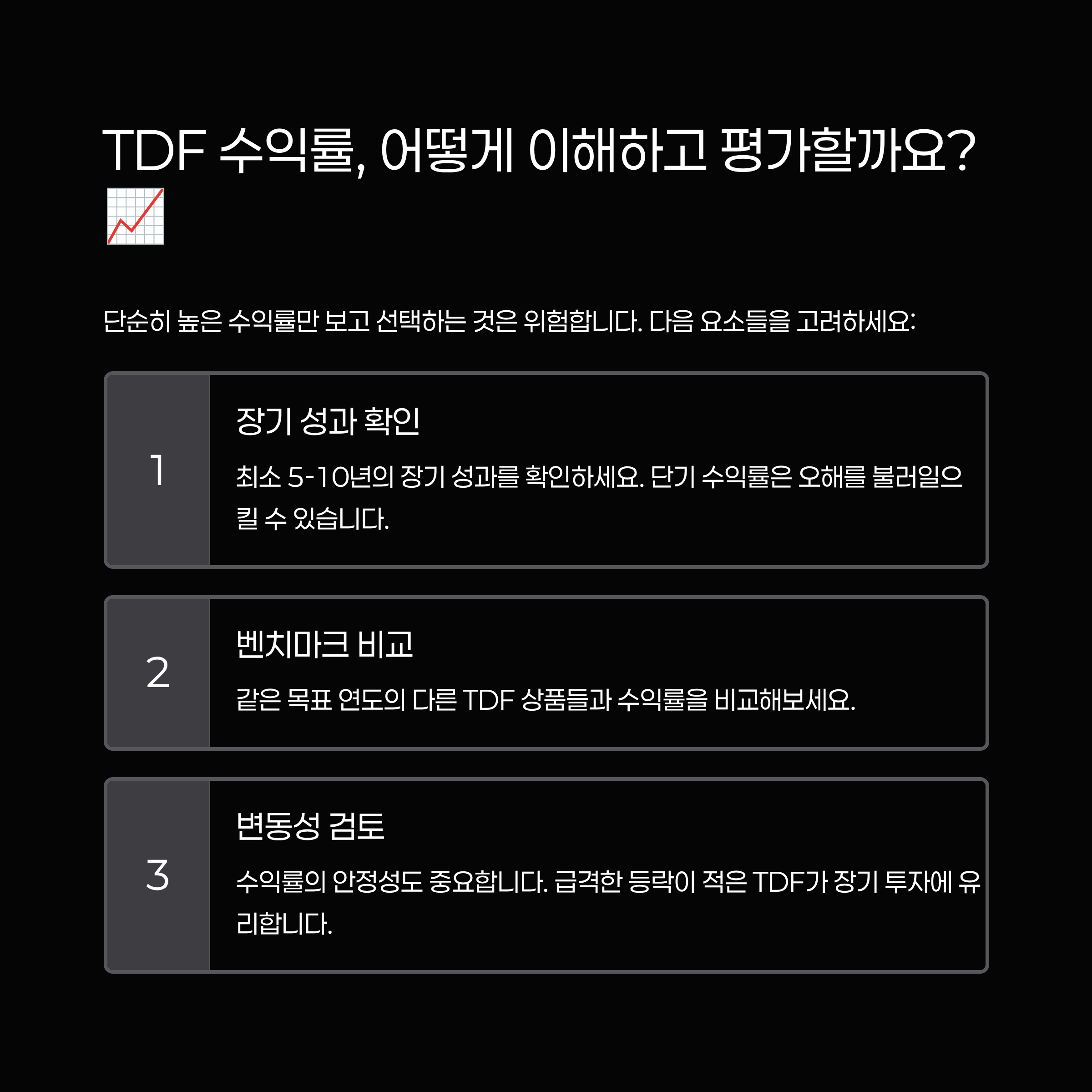 수익률은 TDF를 고를 때 가장 눈길을 끄는 요소입니다. 하지만 단순히 높은 수익률만 보고 선택해서는 안 됩니다. 수익률을 제대로 평가하는 방법에는 비밀이 있습니다.
