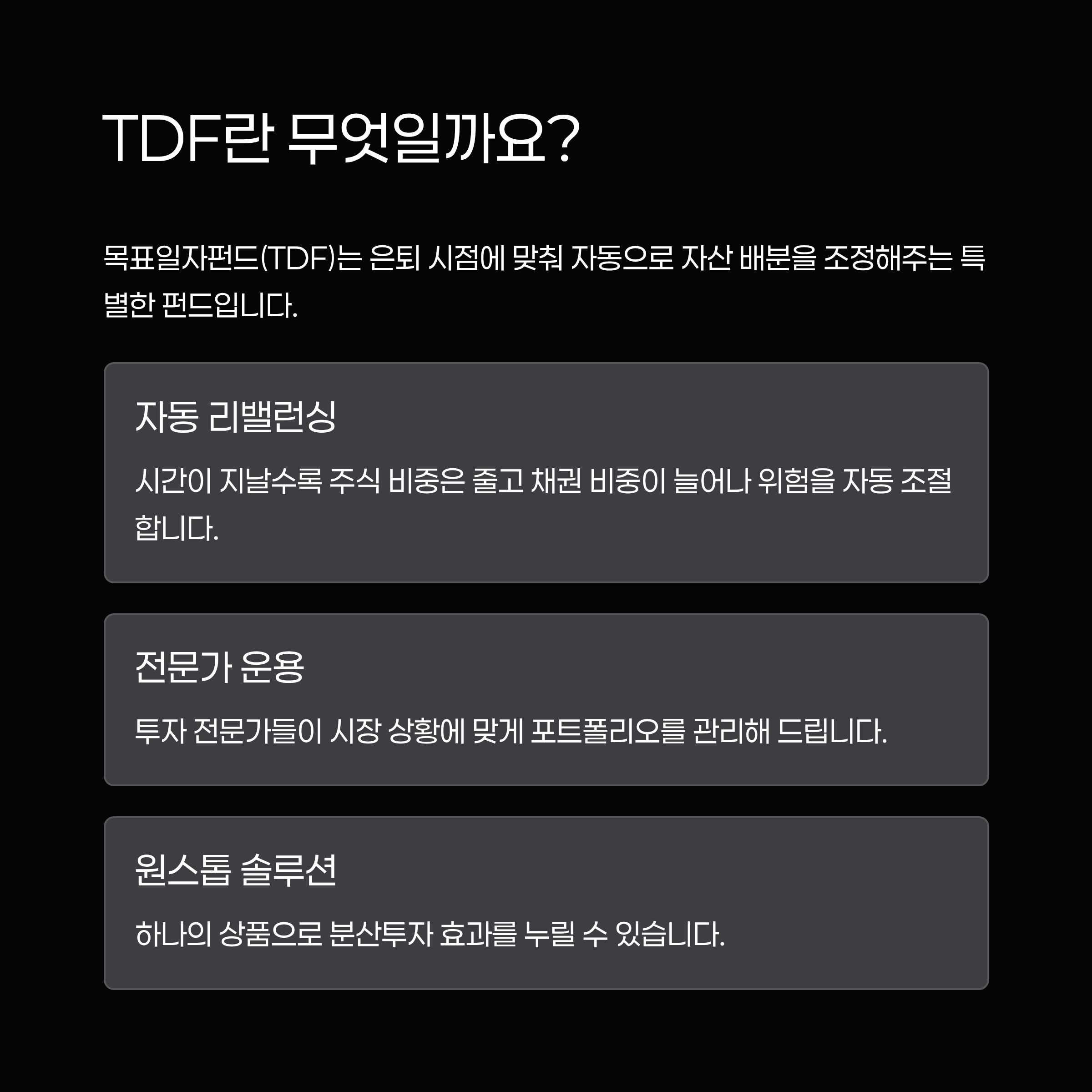 이러한 특징들 덕분에 TDF는 장기 투자를 해야 하는 퇴직연금의 대표적인 솔루션으로 자리 잡았습니다.
