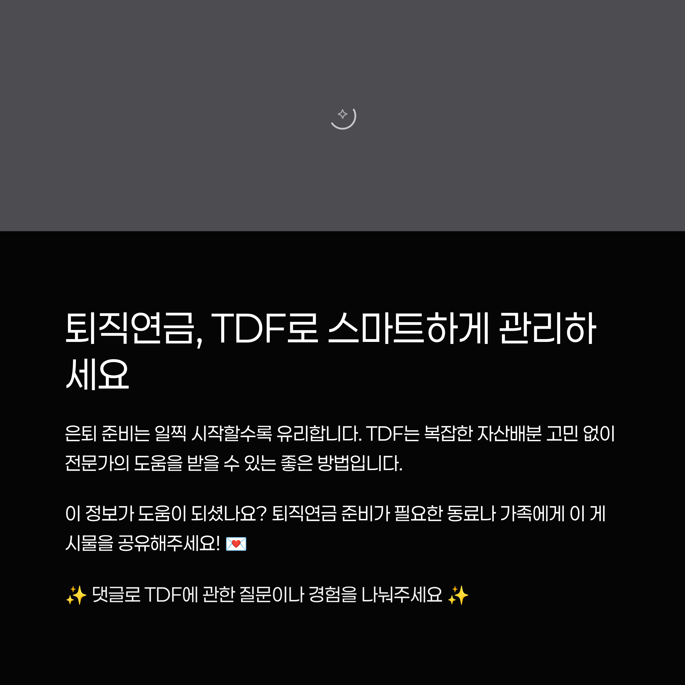- 2. 여러 운용사의 TDF 비교: 특정 운용사의 상품만 보지 말고, 최소 2~3개 이상의 운용사 TDF를 비교해 보세요. 각 운용사별로 강점이 다릅니다.