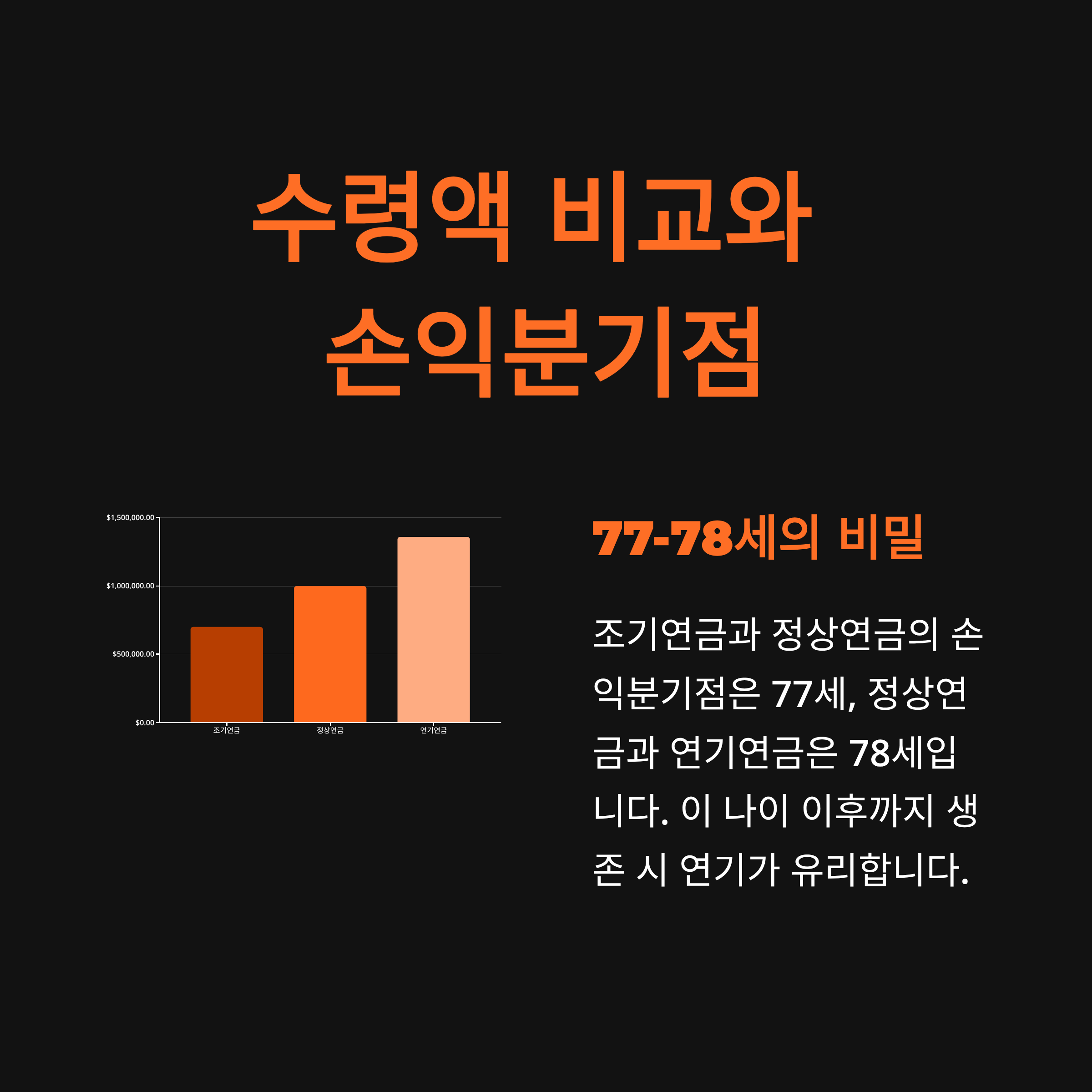 - 손익분기점 (77~78세) 기준: 이 나이 전에 사망할 것 같으면 조기 수령이 유리하고, 이 나이를 넘겨 오래 살면 늦게 받는 것이 유리합니다.
