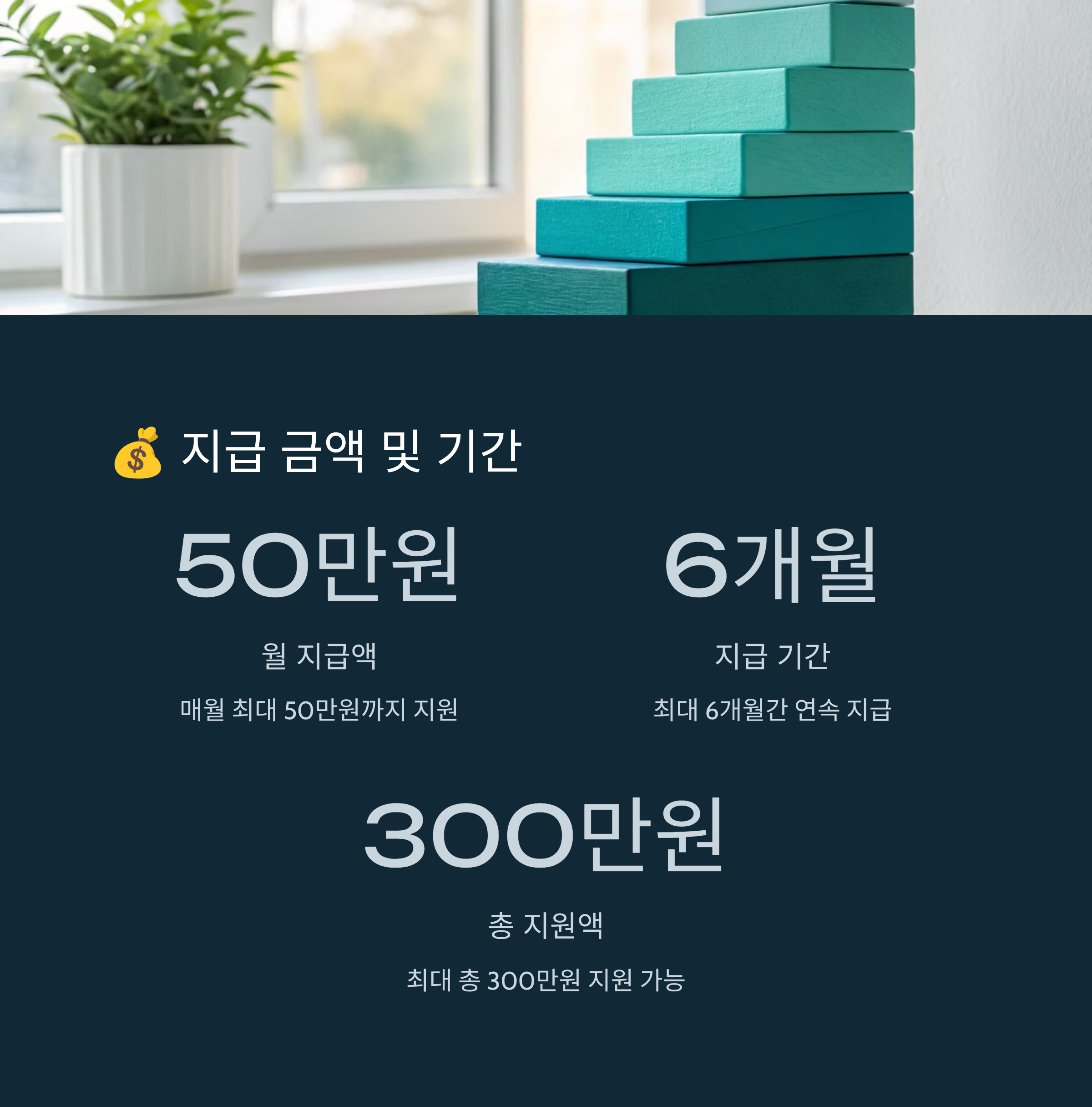 | 지급 금액 | 월 50만 원 (최대 6개월), 부양가족 1인당 10만 원 추가 (월 최대 40만 원) | 총 최대 540만 원 (부양가족 포함 시) | |