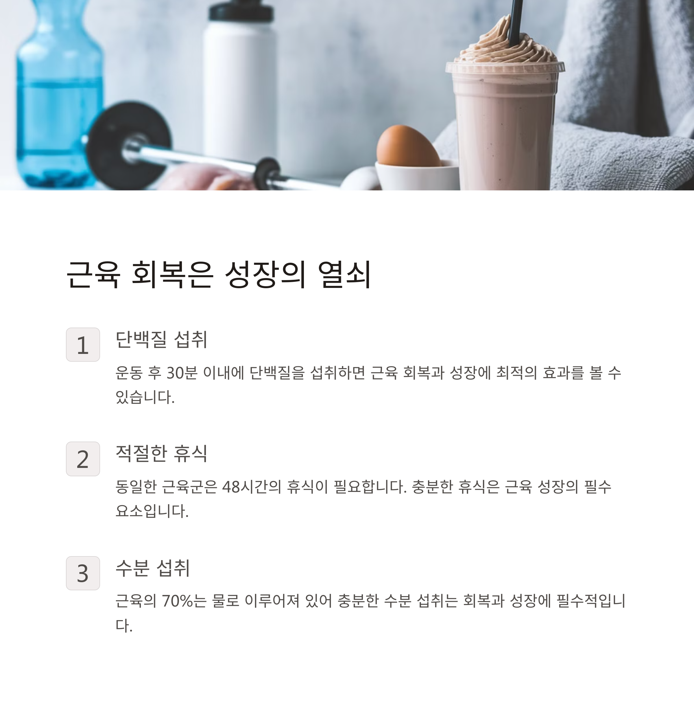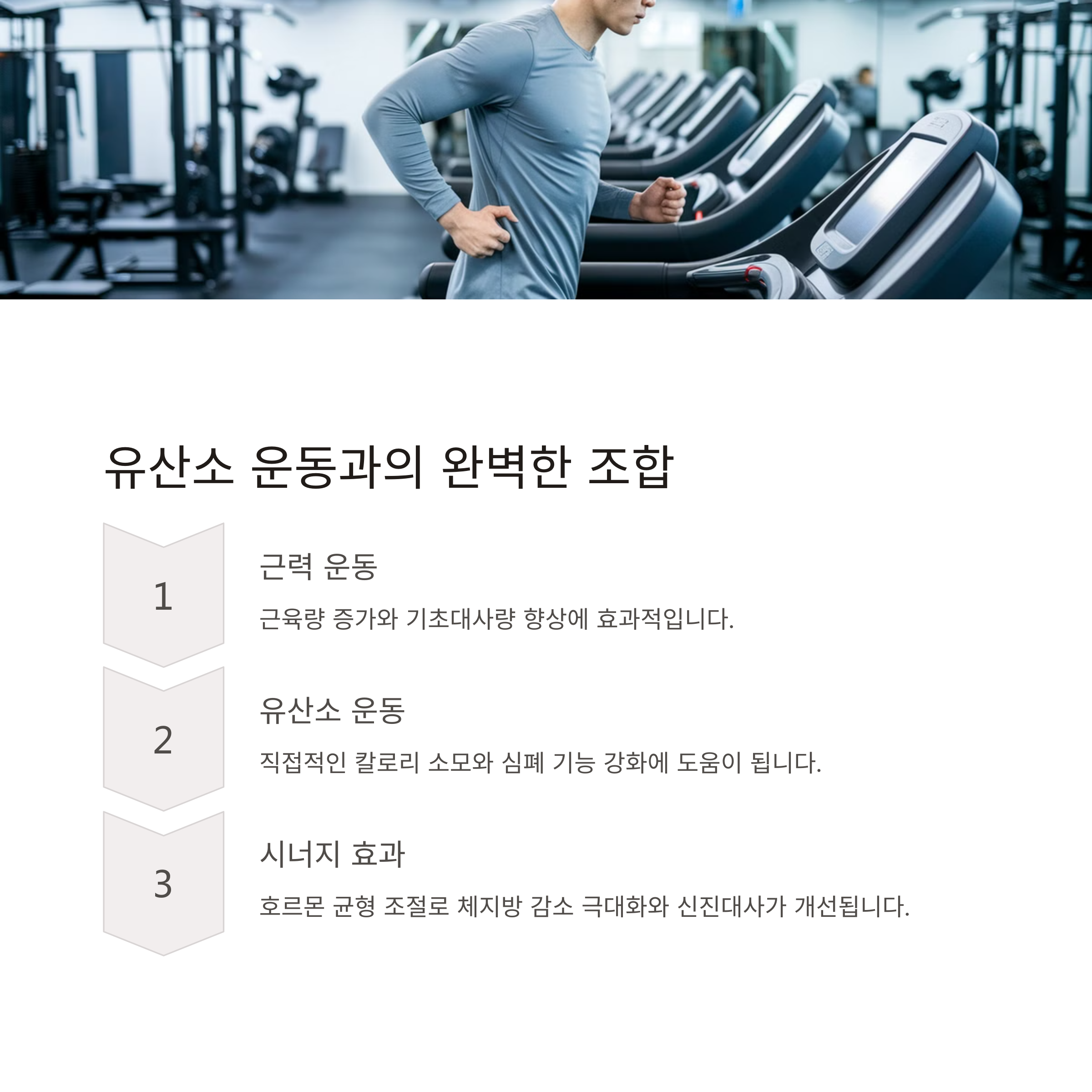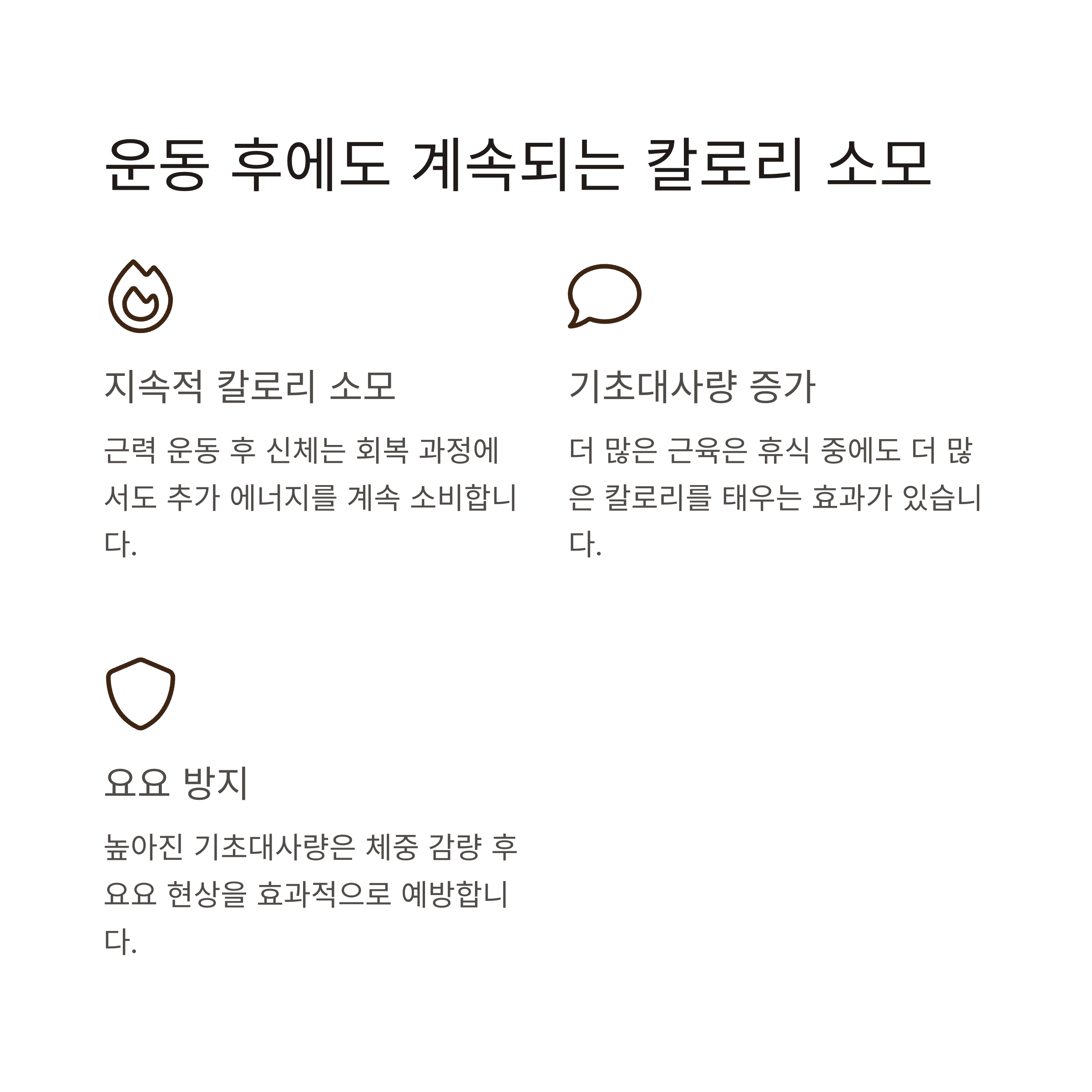 | 근육량 증가로 대사율 향상 | 운동 후에도 지속적인 연소 | 체지방 감소 효과 증가 |