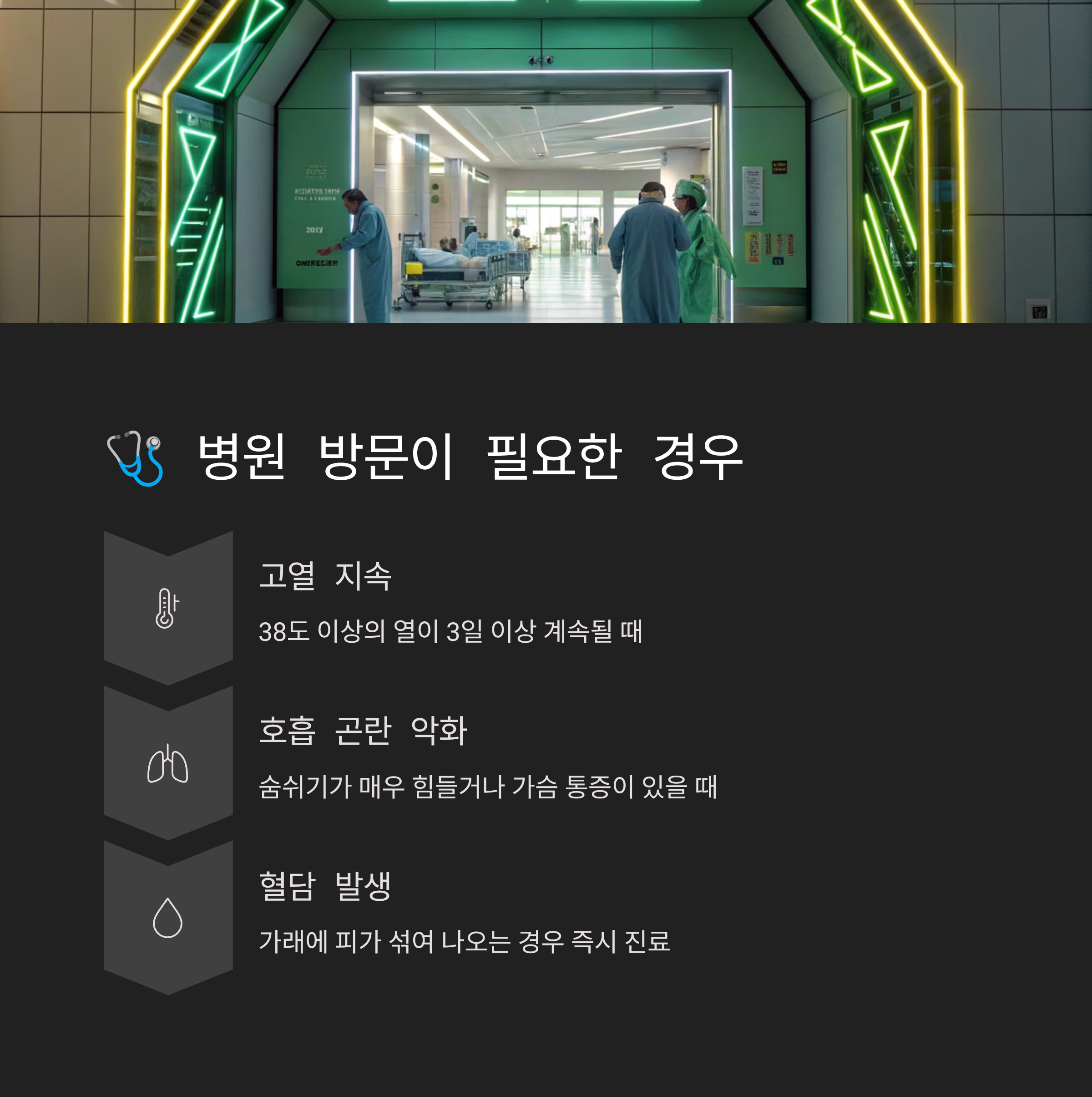- 고열 지속: 38.5℃ 이상의 고열이 3일 이상 지속되거나, 해열제를 먹어도 열이 잘 떨어지지 않을 때.