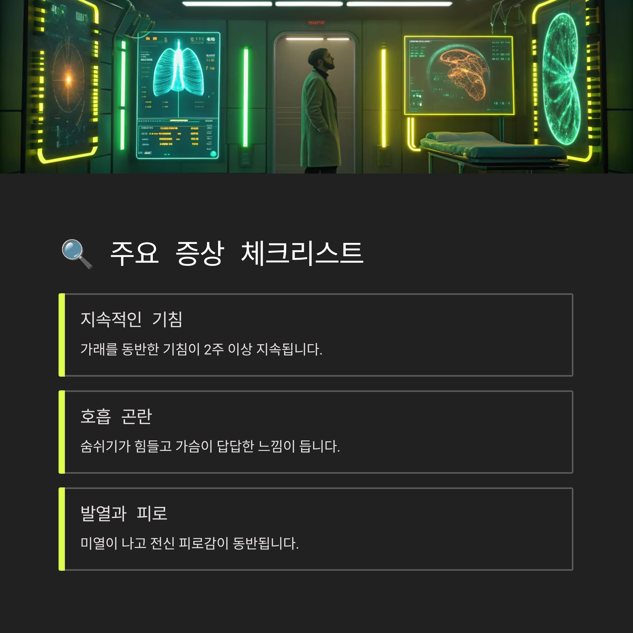 | 주요 증상 | 기침 (마른 기침 → 가래 동반), 가래 (점액성, 화농성), 목 통증, 미열, 피로감, 호흡 곤란, 천명음 | 3주 이상 지속 시 만성 의심, 특정 증상 악화 시 즉시 병원 방문 |