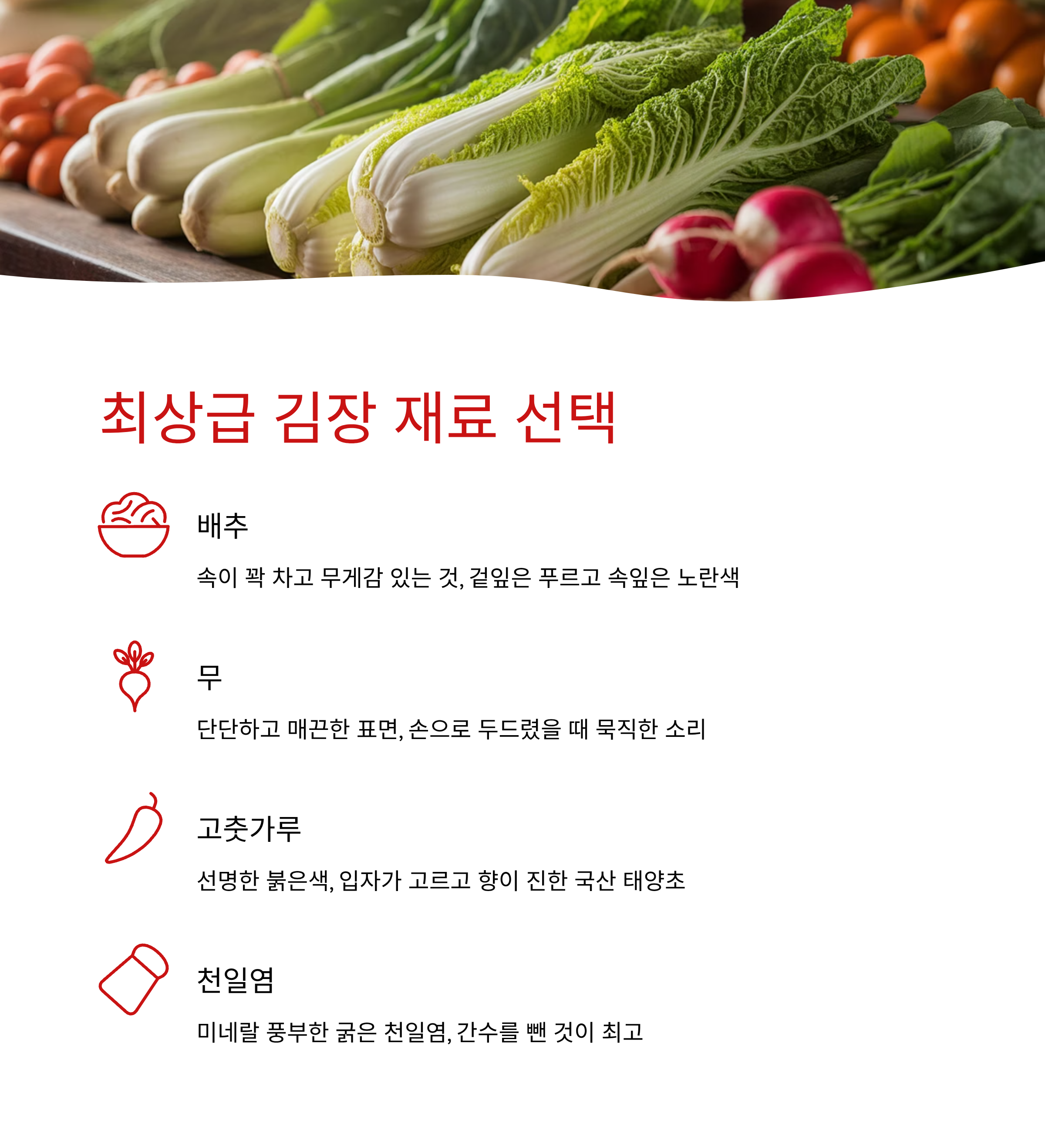 배추는 속이 노랗게 차고 겉잎이 푸른 묵직한 것을 고르는 것이 좋아요. 무는 잔뿌리가 적고 단단하며, 윗부분에 초록빛이 도는 것이 달콤해요. 고춧가루는 태양초가 색이 곱고 맛도 뛰어나며, 천일염은 3년 이상 간수를 뺀 것을 사용해야 쓴맛 없이 깔끔하게 절여진답니다.