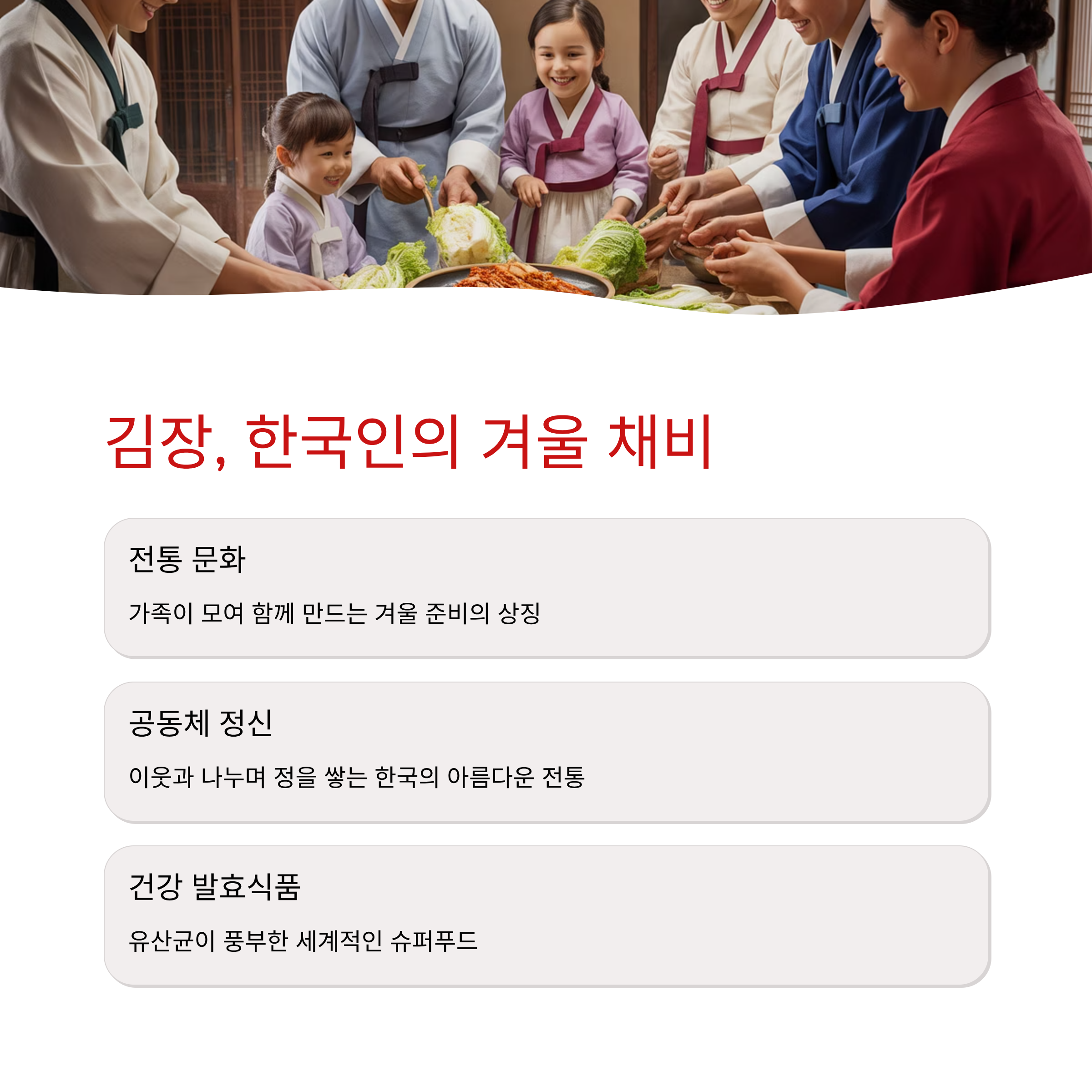 찬바람이 불기 시작하면 한국인의 마음은 바빠지기 시작해요. 바로 1년 중 가장 큰 행사인 '김장' 때문이죠! 김장은 단순한 겨울철 반찬 준비를 넘어, 가족과 이웃이 함께 모여 정을 나누는 유네스코 무형유산으로 등재된 우리 고유의 문화예요.