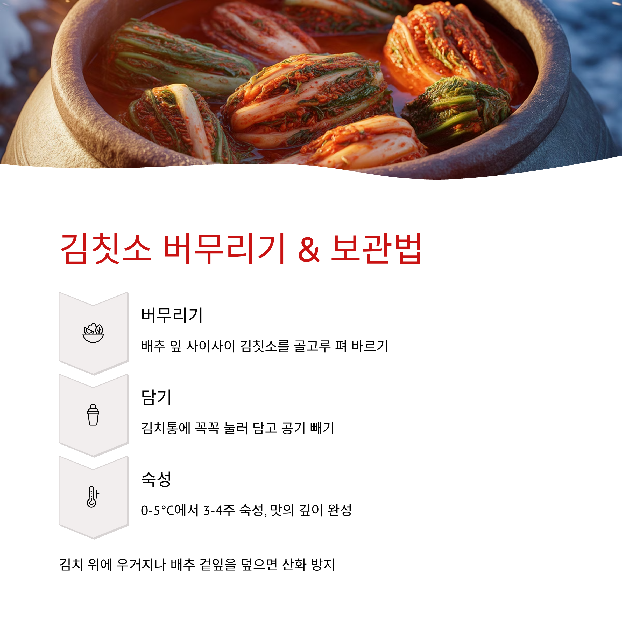 | 1개월 후 | 완숙 (신김치) | 새콤하고 강한 유산균 맛 | 김치찌개, 김치찜, 부침개 |