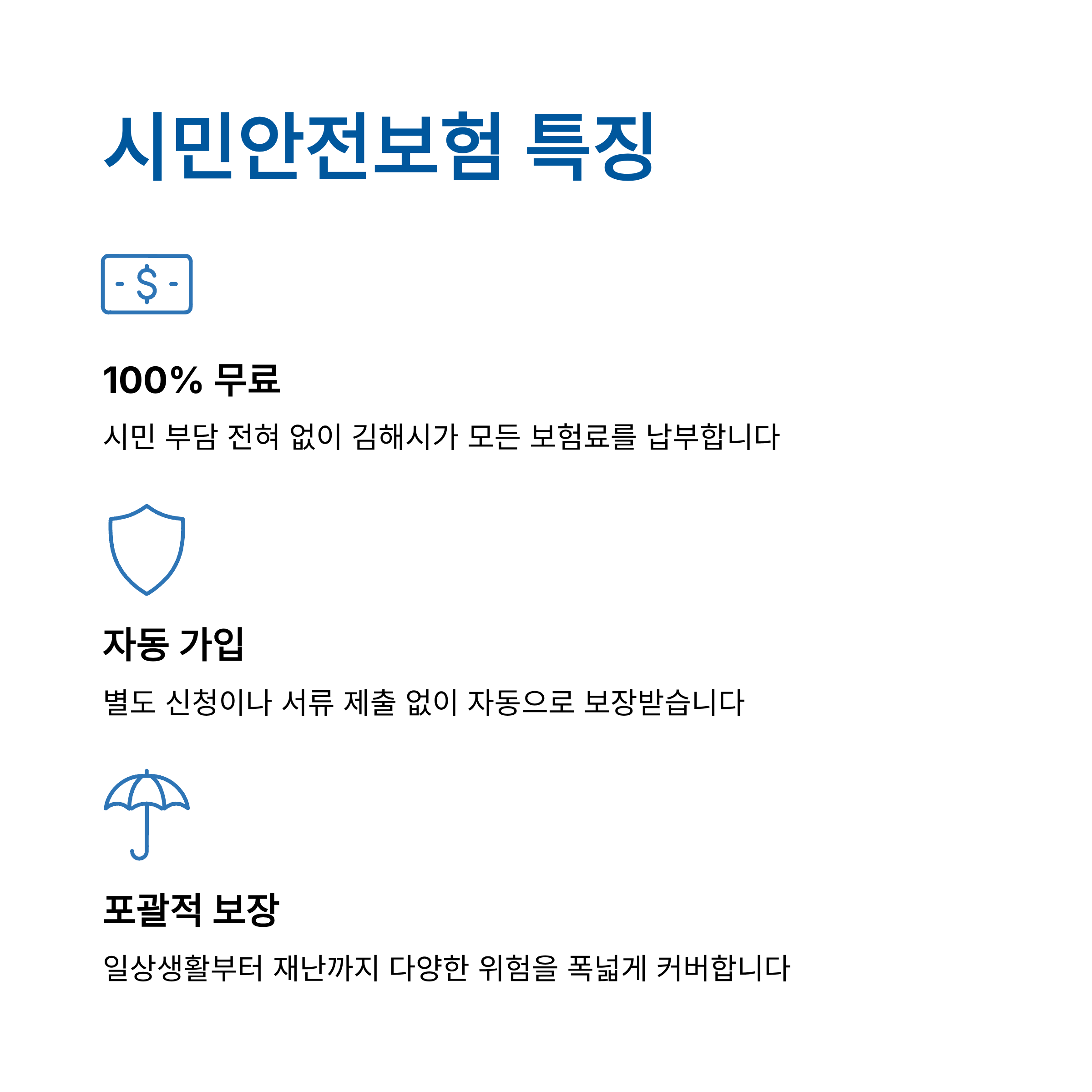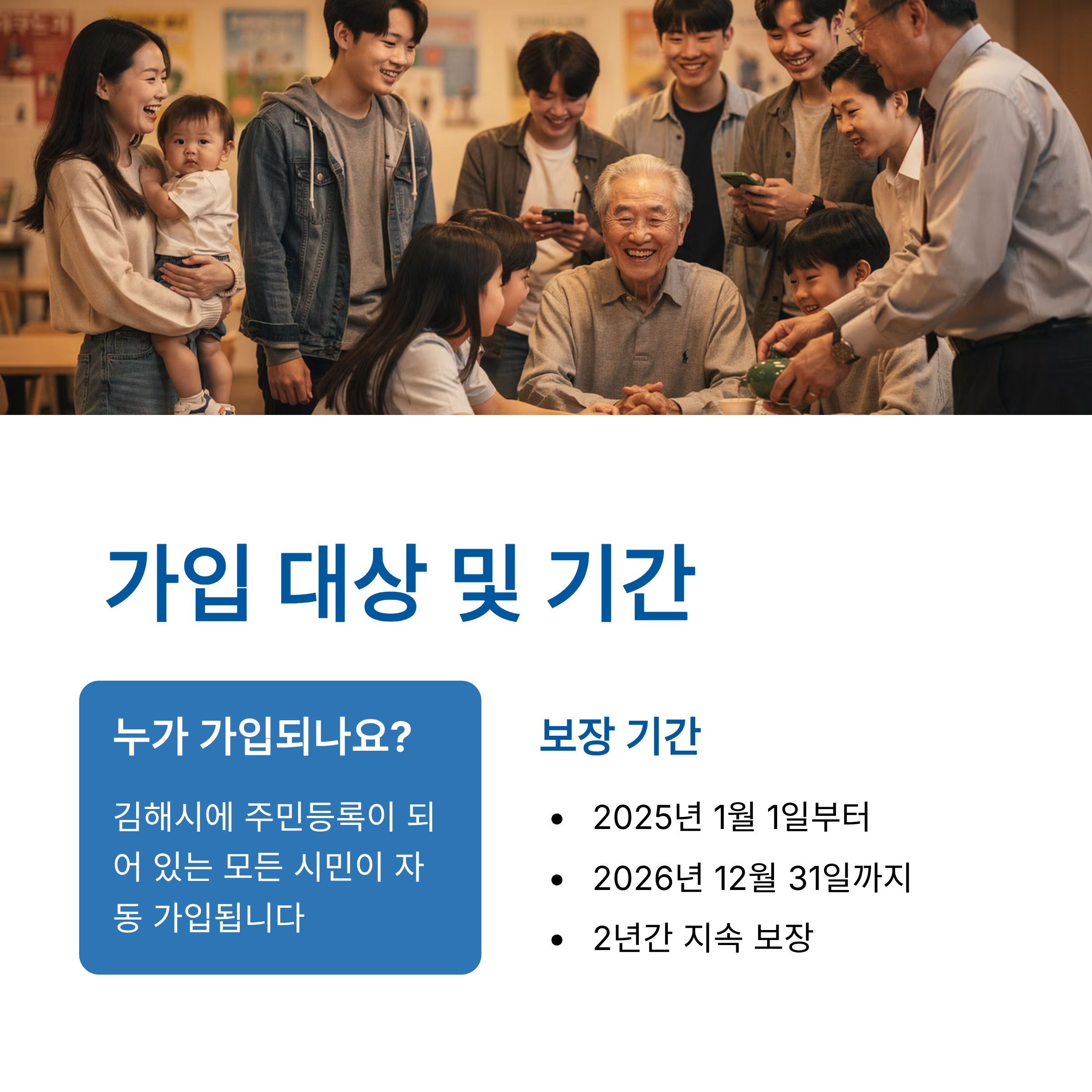- 무료 자동 가입: 김해시민이라면 누구나, 별도의 절차 없이 보험료 부담 없이 자동으로 가입됩니다.