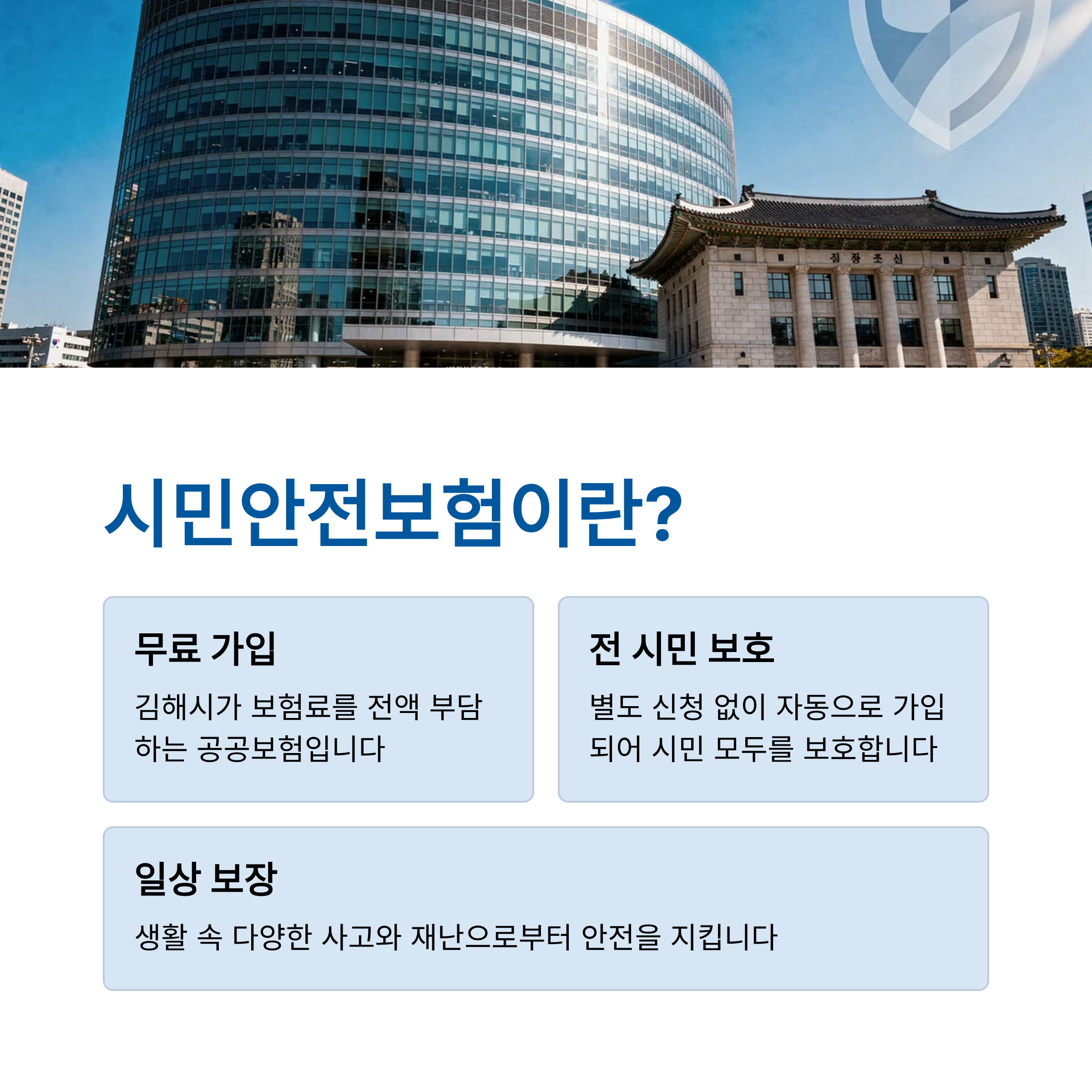 - 보험료 부담 없음: 김해시가 보험료 전액을 부담하므로, 시민들은 아무런 비용 없이 자동으로 보험 혜택을 받을 수 있습니다.