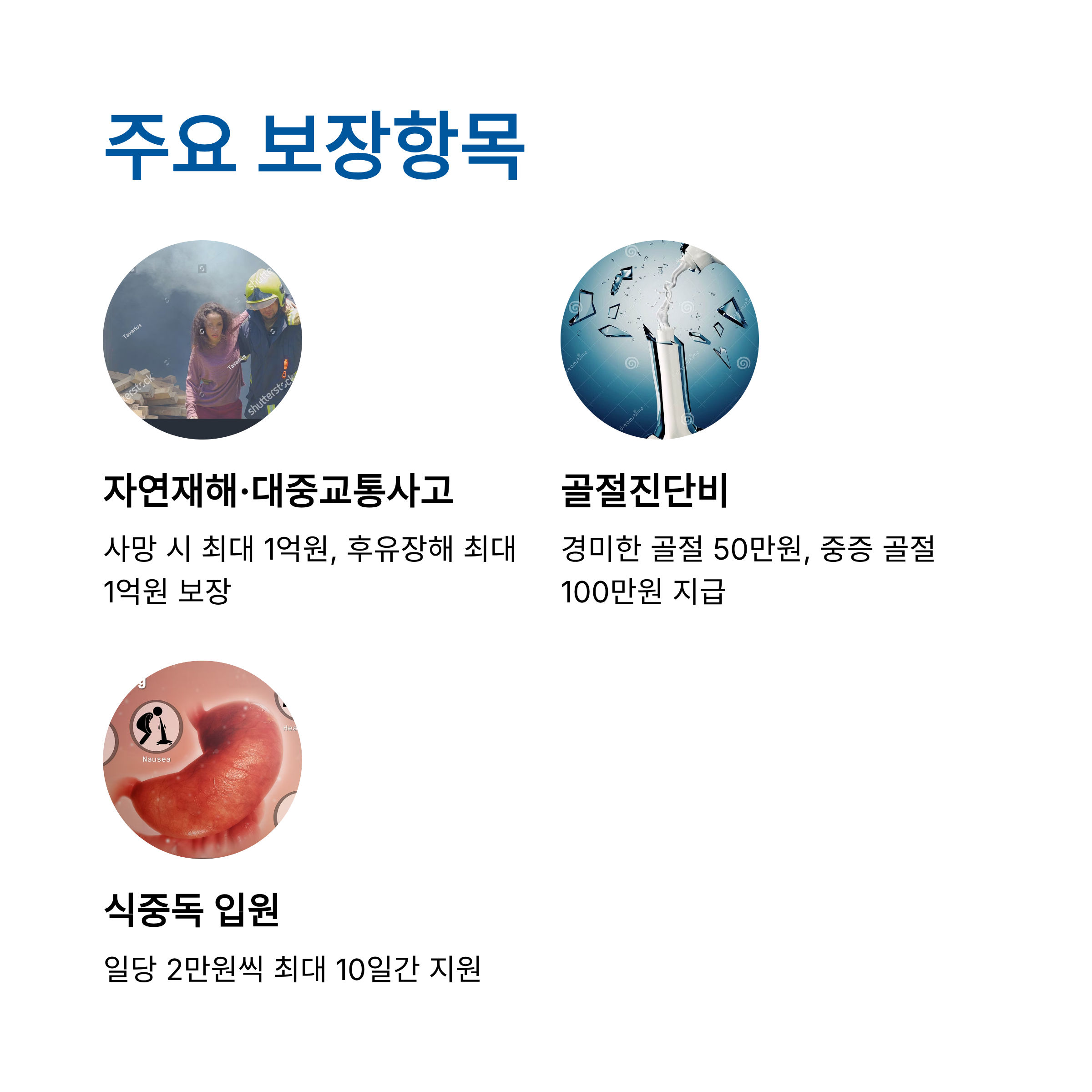 | 대중교통 사고 사망·후유장해 | 최대 1,000만원 |