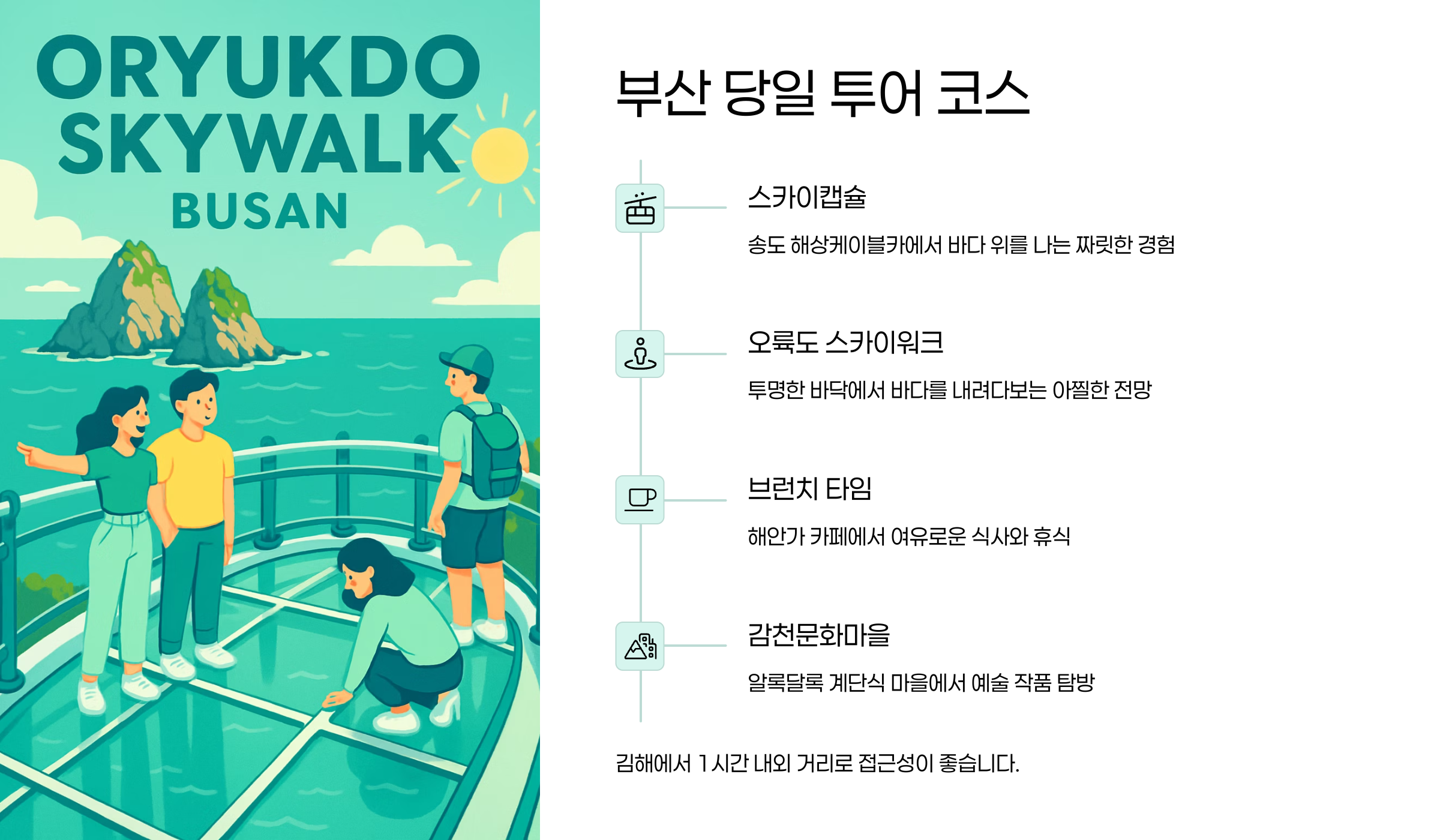 10:00김해 출발11:00감천문화마을 도착 - 알록달록 골목길 산책 및 스탬프 투어13:00점심 식사 (남포동 BIFF 광장 근처 - 씨앗호떡 등 길거리 음식 체험)14:30자갈치 시장 구경 (활기찬 어시장 풍경)15:30흰여울문화마을 이동 - 해안 절벽 따라 산책 및 카페에서 휴식17:30(선택) 광안리 해수욕장 잠시 들러 광안대교 감상18:30부산 출발19:30김해 도착