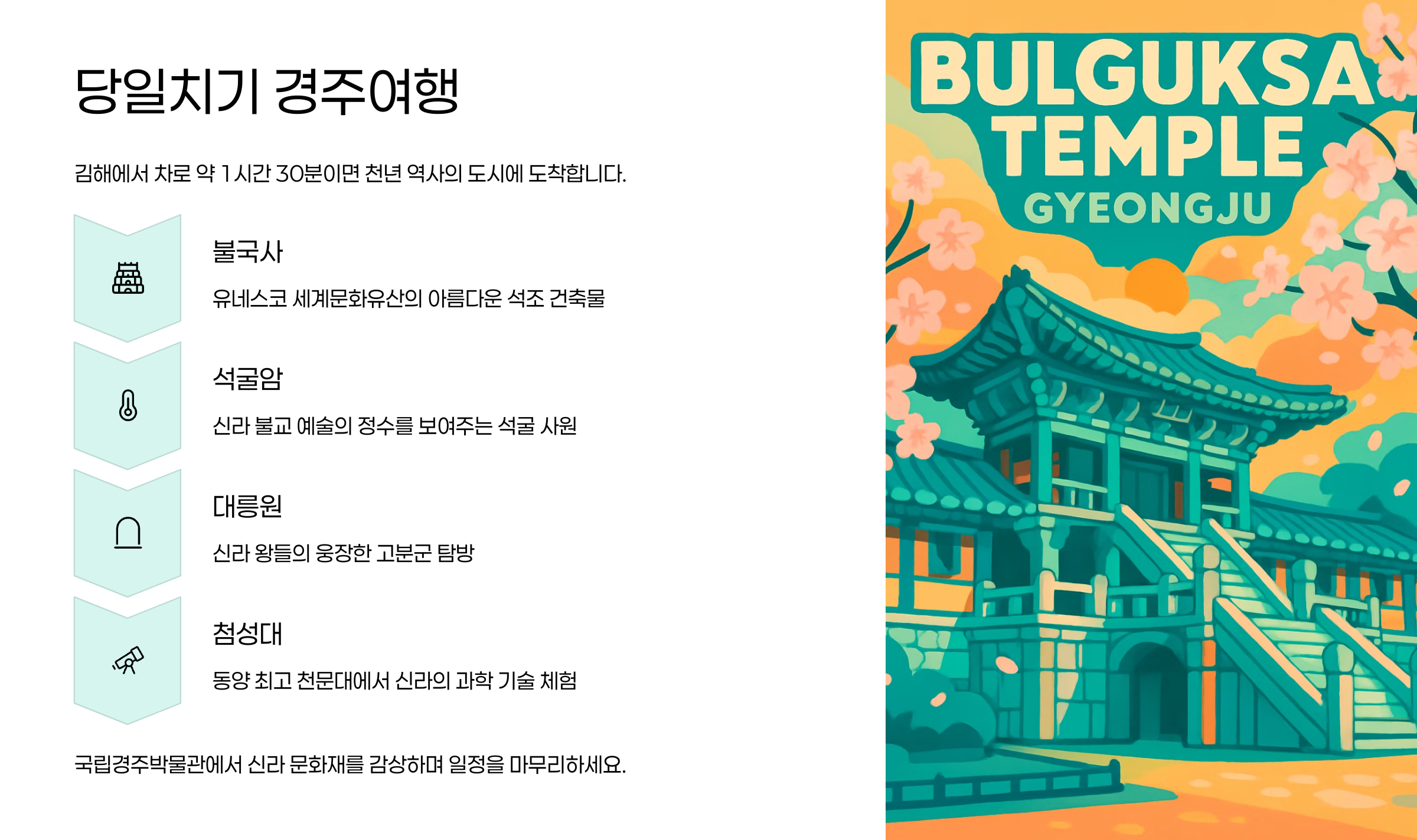 09:00김해 출발10:30불국사 도착 및 관람 (유네스코 세계유산)12:30점심 식사 (불국사 근처 또는 황리단길 이동 후 식사)14:00황리단길 도착 - 예쁜 카페, 소품샵 구경, 길거리 간식 즐기기16:00대릉원(천마총) 산책 및 포토존 사진 찍기17:00동궁과 월지(안압지) 또는 첨성대 주변 관람 (시간 여유 시 야경 추천)18:00경주 출발19:30김해 도착