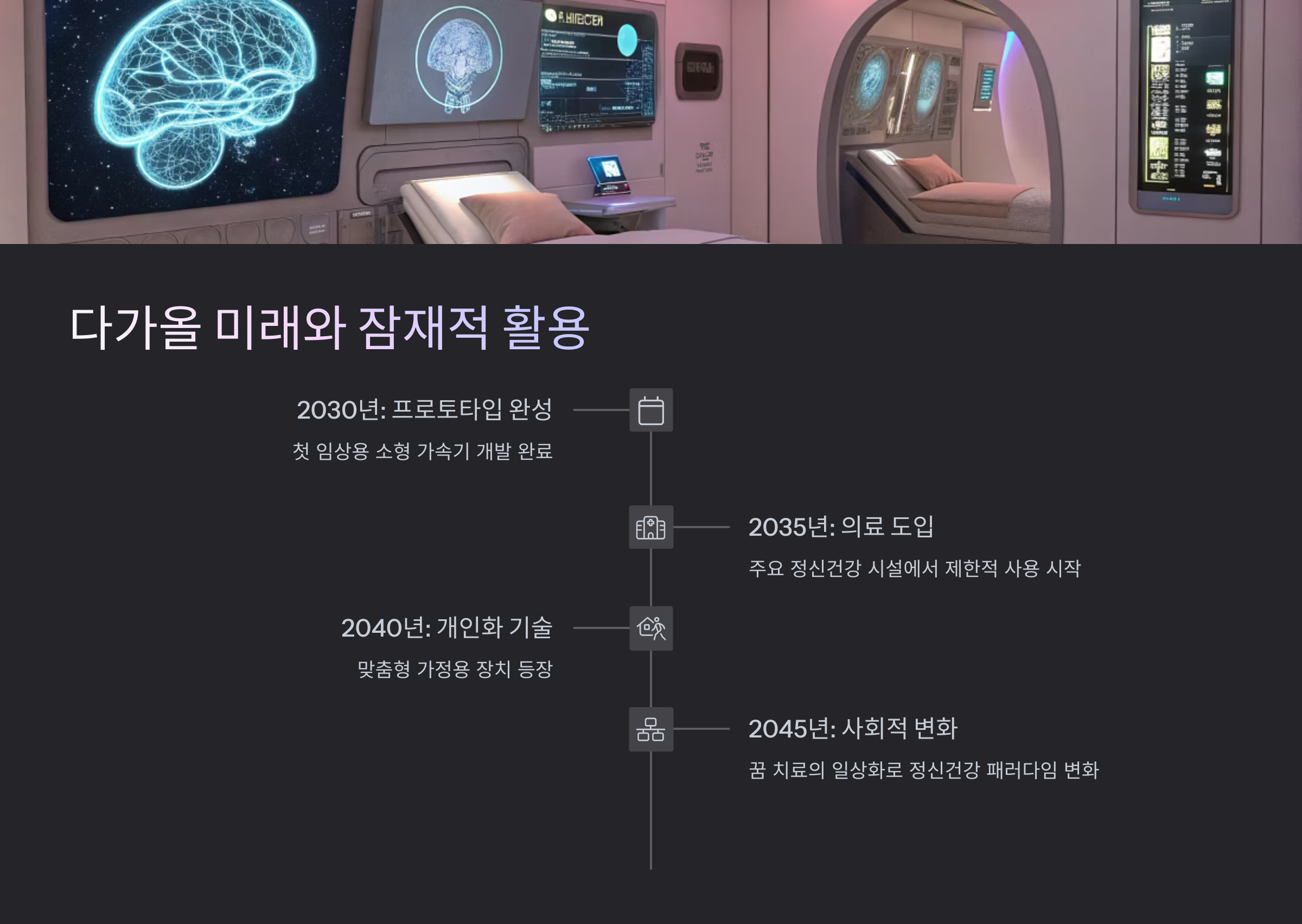 앞으로 20년 내에 꿈의 치료기와 중립자 가속기는 의학, 교육, 심리, 예술 등 다양한 분야에 놀라운 변화를 일으킬 수 있어요. 특히 AI와 융합되면 꿈의 내용을 실시간으로 해석하고 재구성하는 기능까지 가능해질지도 몰라요.
