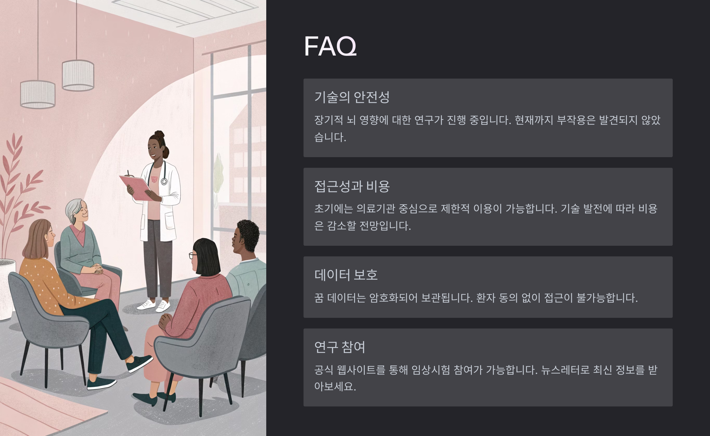 두 번째로는 윤리 문제예요. 사람의 꿈에 인위적으로 개입한다는 건, 프라이버시를 넘어서 인간의 자율성과 정체성까지 침해할 수 있는 민감한 부분이에요. 미국과 유럽의 윤리위원회에서도 이 기술을 ‘조건부 승인’으로 분류하고 있어요.