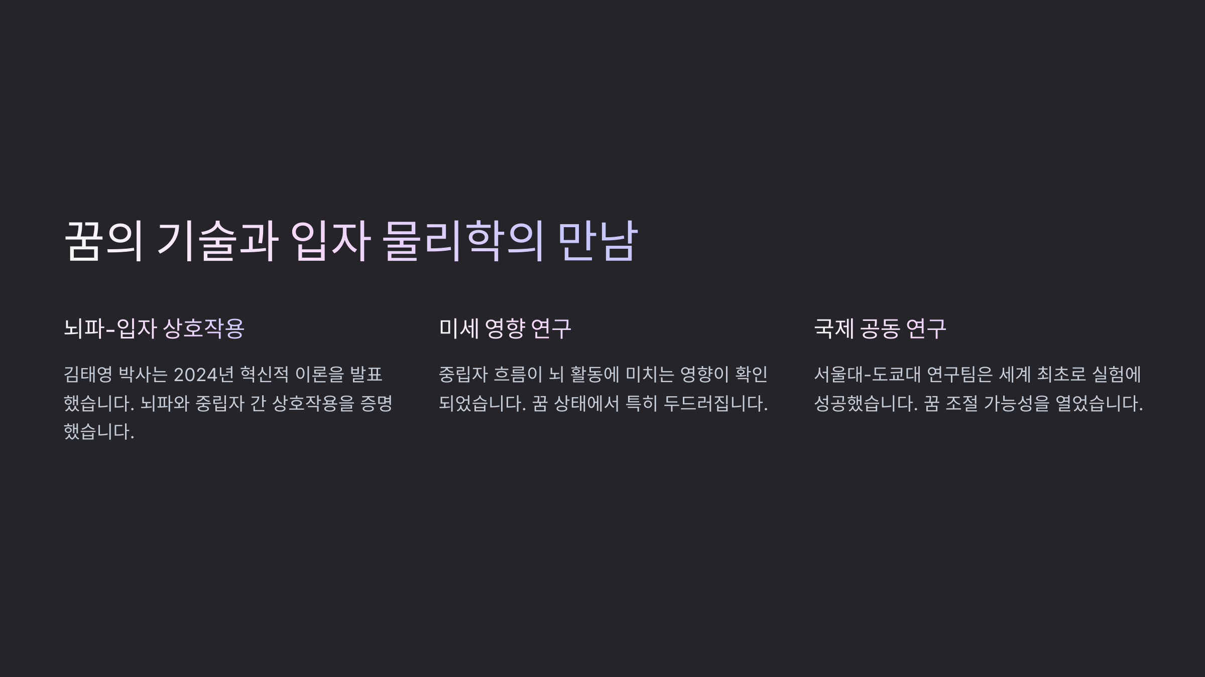 2024년 유럽의 'Human Brain Project'에서는 중성자 회절 기술을 활용해 꿈을 꾸는 동안 활성화되는 시냅스 구조를 분석하는 연구가 시작됐어요. 이는 꿈의 패턴을 실시간으로 해석하고, 치료 목적에 따라 '꿈 속 경험'을 맞춤형으로 설계하는 데 활용되고 있어요.