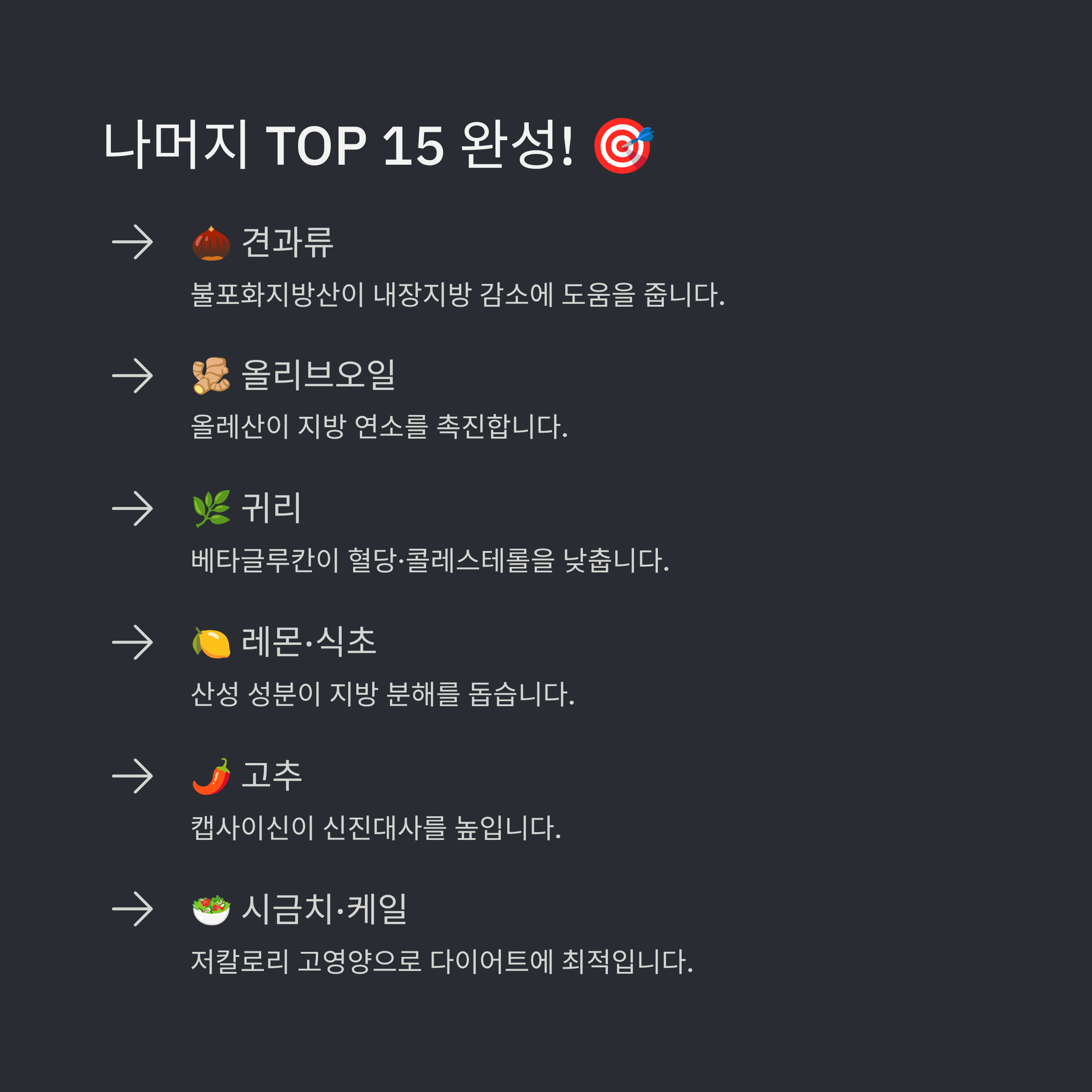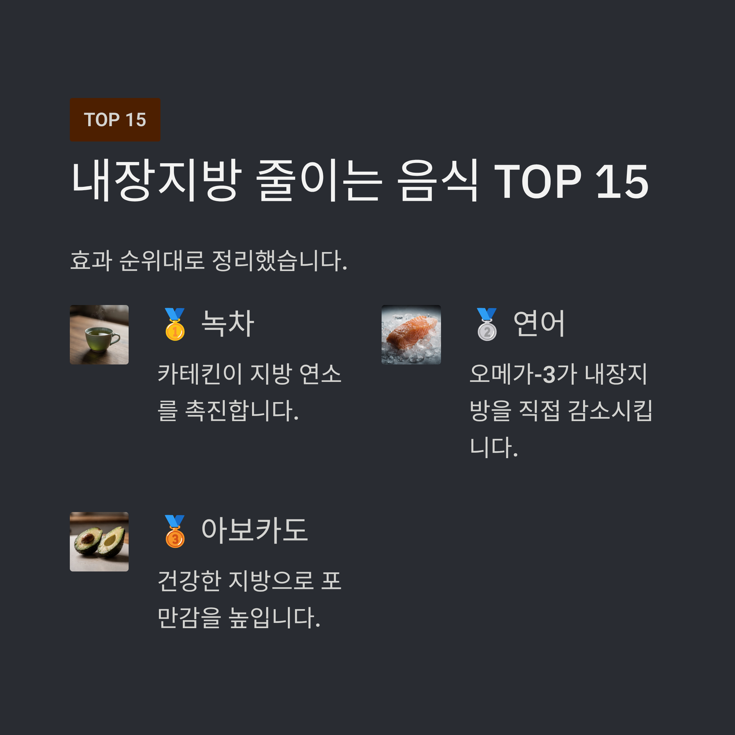 내장지방 줄이는 음식 TOP 15 (2026년 기준 효과 순위)