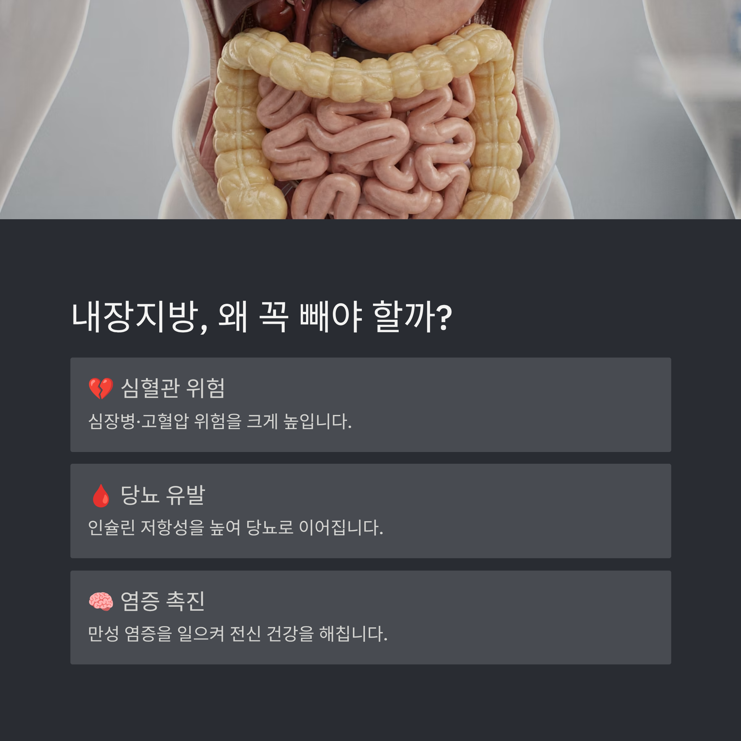 내장지방은 간·췌장·장 주위에 쌓여 염증물질을 분비하고 인슐린 저항성을 높입니다. 그래서 다음 질환 위험이 3~5배 이상 증가해요.