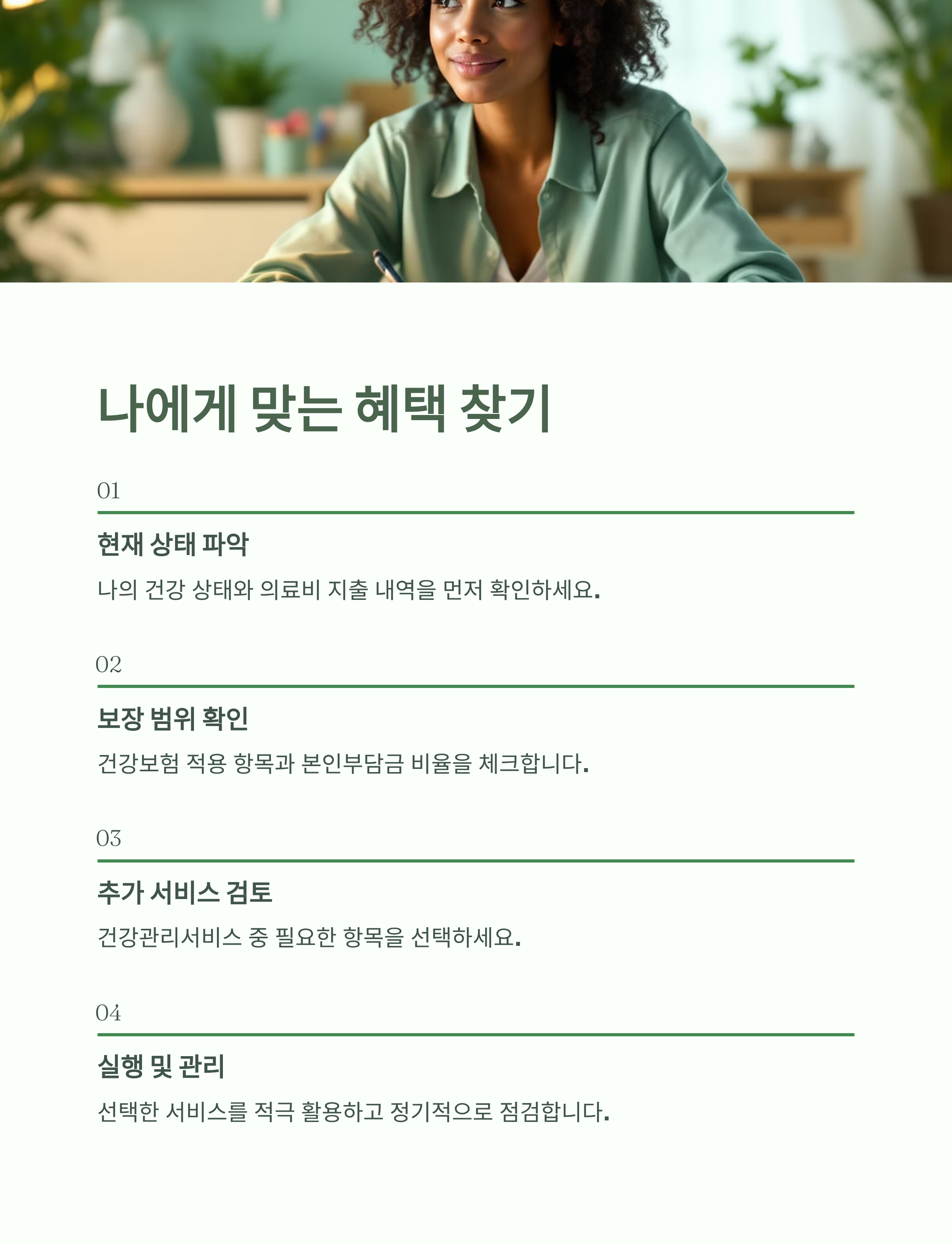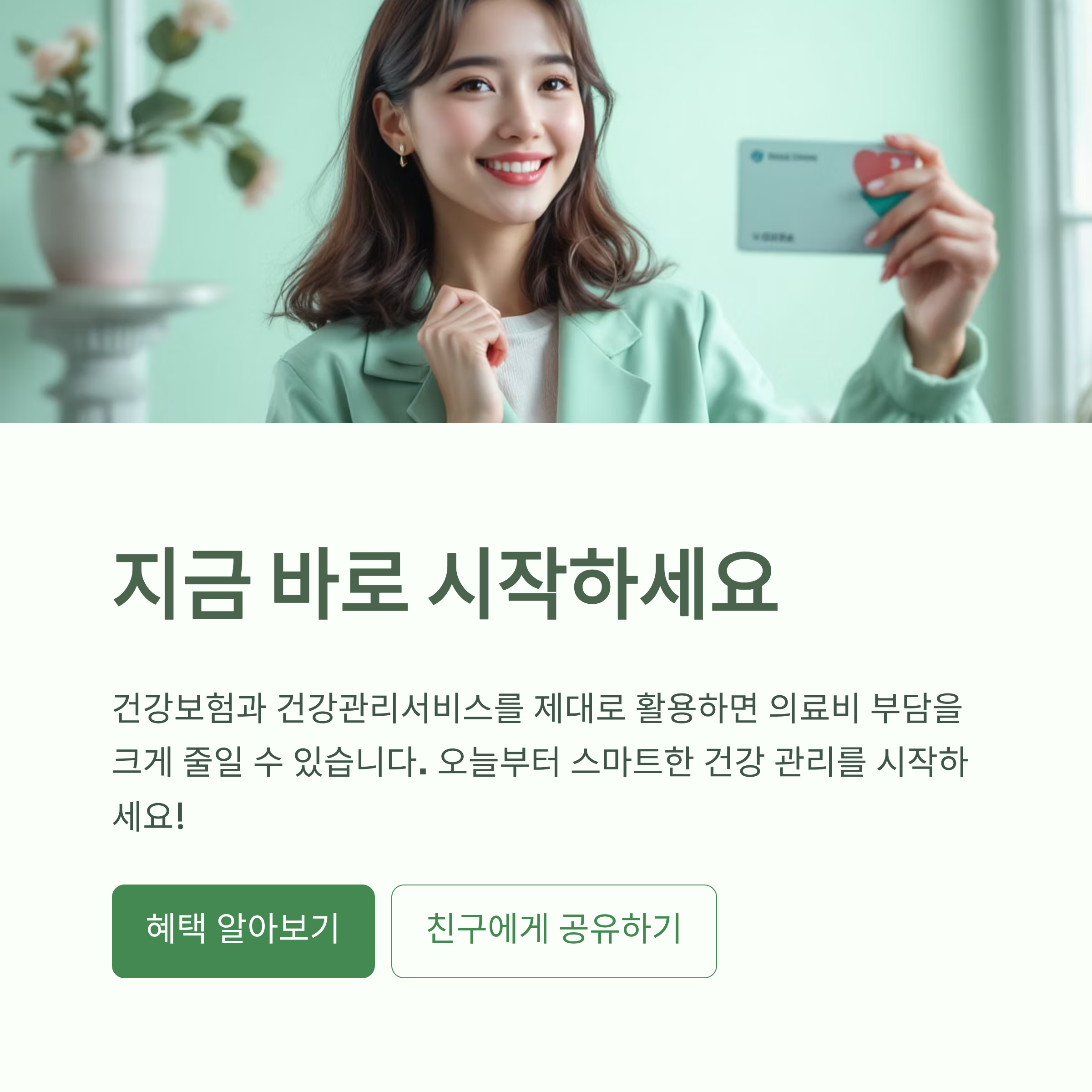 - 지금은 건강하지만 예방하고 싶다면 → 건강관리서비스를 적극적으로 활용해야 합니다. 정기적인 건강 상담과 생활습관 개선 프로그램은 미래의 의료비를 줄이는 최고의 투자입니다.