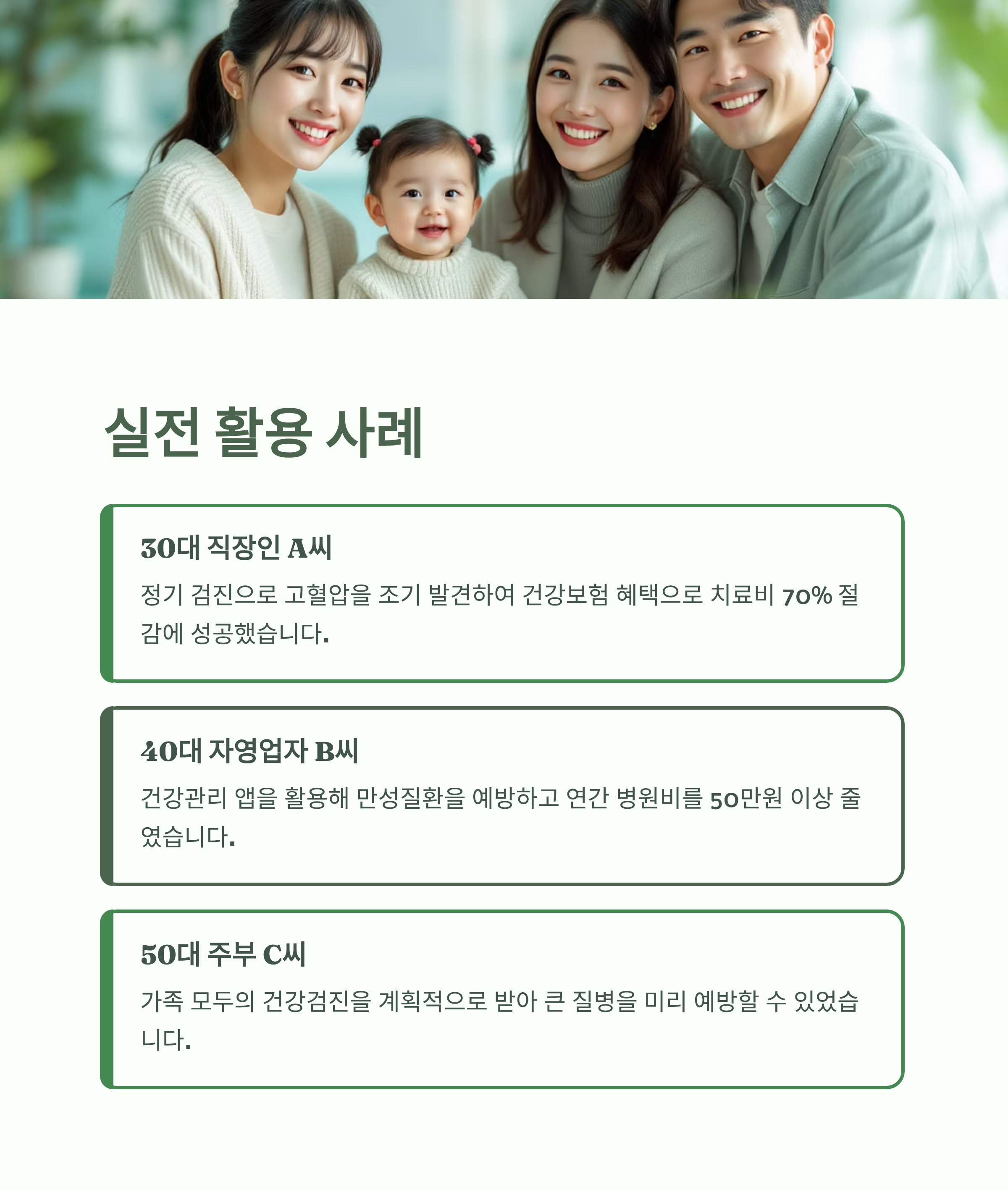 - 사례 2 (60대 당뇨 환자 B씨): B씨는 매달 병원에서 국민건강보험 혜택으로 저렴하게 진료를 받고, 보건소의 '당뇨 합병증 검사'를 무료로 받으며 주기적으로 건강 상태를 체크합니다. 덕분에 큰 비용 들이지 않고 체계적인 관리가 가능해졌습니다.