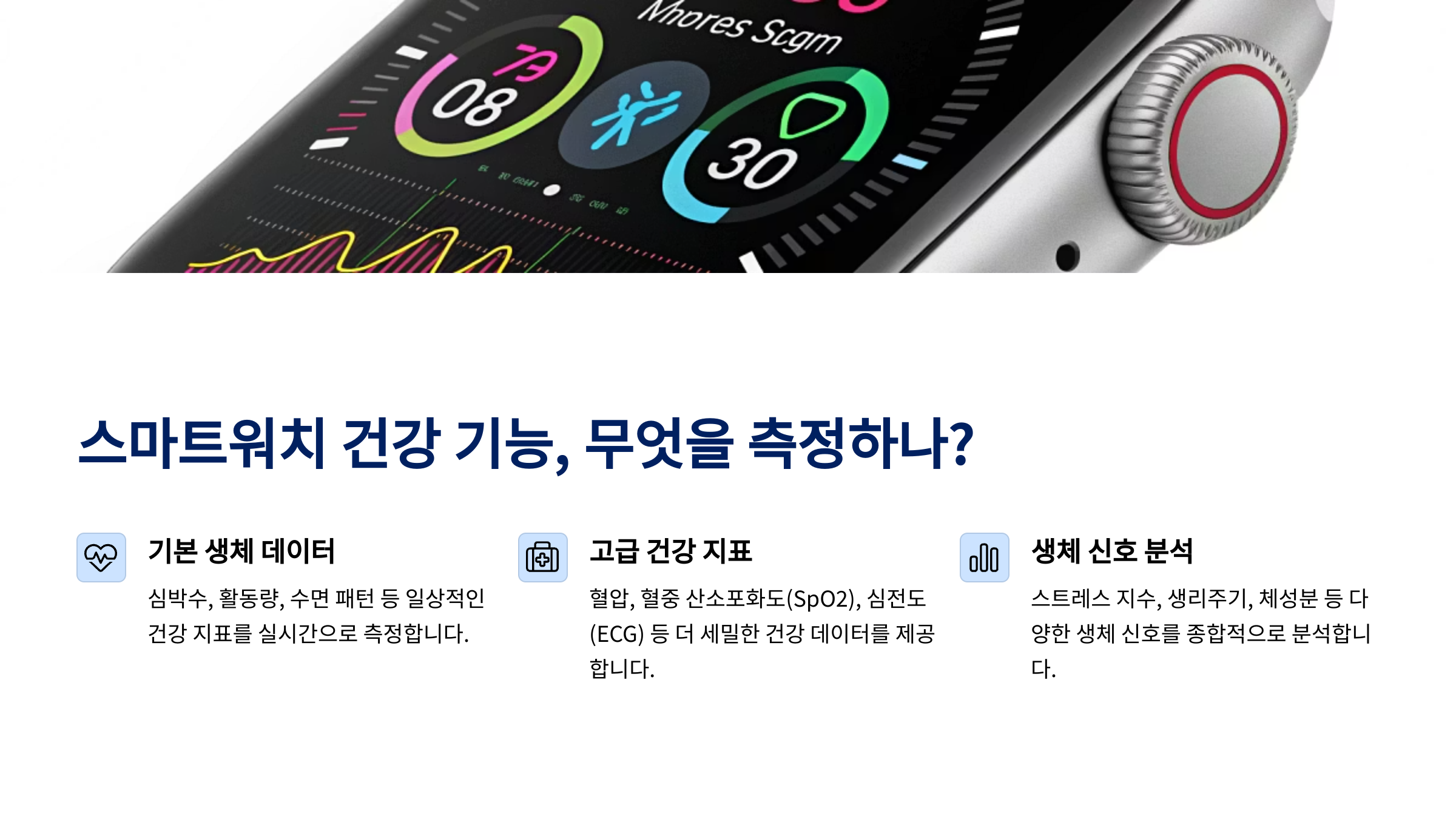 스마트워치의 **건강 기능**이란, 시계에 내장된 다양한 센서(가속도계, 자이로스코프, 광학 심박 센서, 전기 심박 센서, 적외선 센서 등)를 활용하여 사용자의 생체 신호나 활동 상태를 측정하고, 이를 분석하여 건강 관련 **데이터**를 제공하는 모든 기능을 의미합니다.