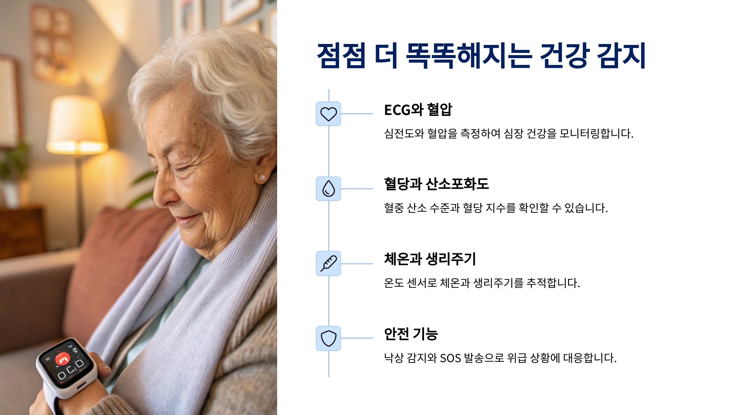 초기 스마트워치는 주로 걸음 수나 이동 거리 같은 기본적인 활동량 측정에 집중했지만, 기술이 발전하면서 심박수, 수면 패턴 분석은 기본이고, 심전도(ECG), 혈중 산소 포화도(SpO2), 피부 온도 변화, 넘어짐 감지 등 점점 더 전문적이고 다양한 건강 지표를 측정할 수 있게 되었습니다. 📈