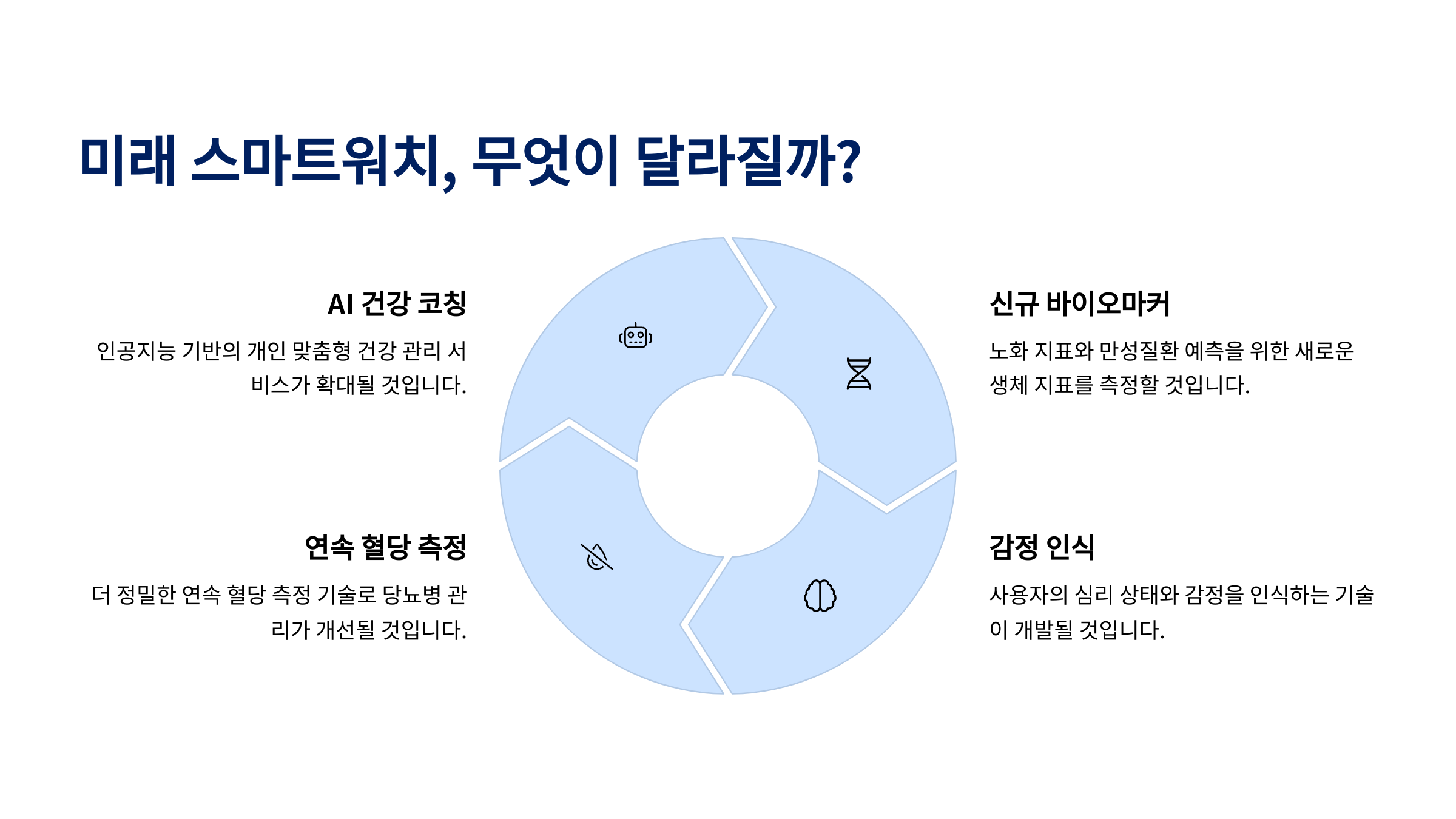 - 비침습적 혈당 측정: 당뇨병 환자에게 매우 중요한 혈당 측정은 현재 기술로는 스마트워치만으로 정확하게 구현하기 매우 어렵습니다. 피부를 찌르지 않고(비침습적) 혈당을 측정하는 기술은 활발히 연구 중이지만, 상용화된 스마트워치에서 신뢰할 만한 수준으로 제공되지는 않고 있습니다.