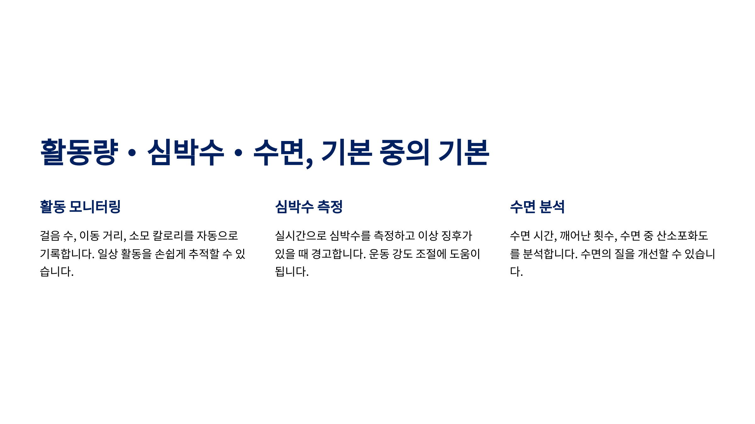 대부분의 스마트워치가 기본적으로 제공하는 핵심 건강 데이터 3가지는 바로 활동량, 심박수, 수면 데이터입니다. 각각 어떻게 측정되고 어떤 정보를 알려주는지 살펴볼까요?