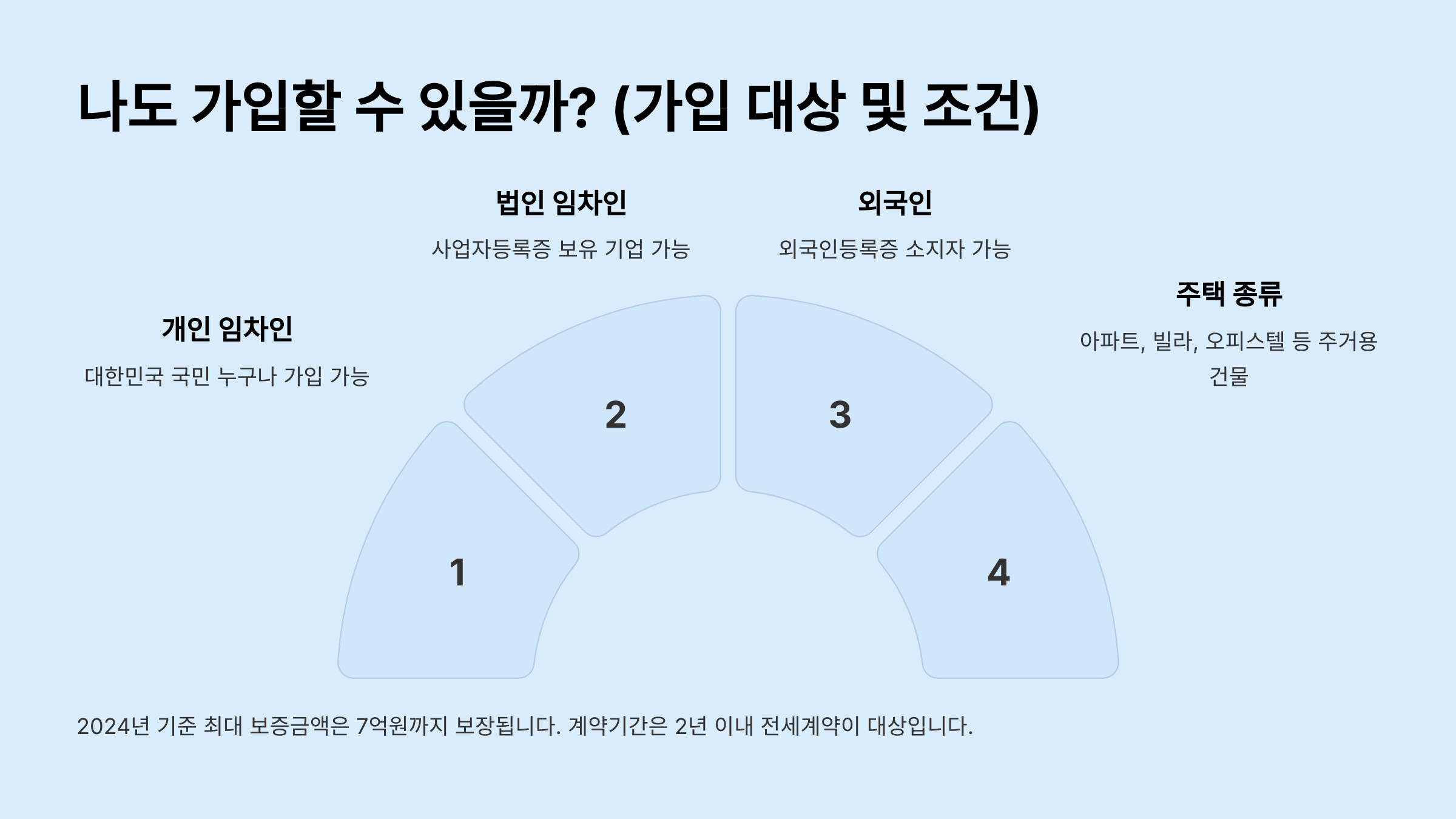 전세보증금 반환보증은 누구나, 모든 주택에 대해 가입할 수 있는 것은 아닙니다. 주택도시보증공사(HUG)의 상품을 기준으로 주요 가입 대상과 조건을 살펴보겠습니다. (세부 조건은 변동될 수 있으므로 신청 시점 확인 필수)