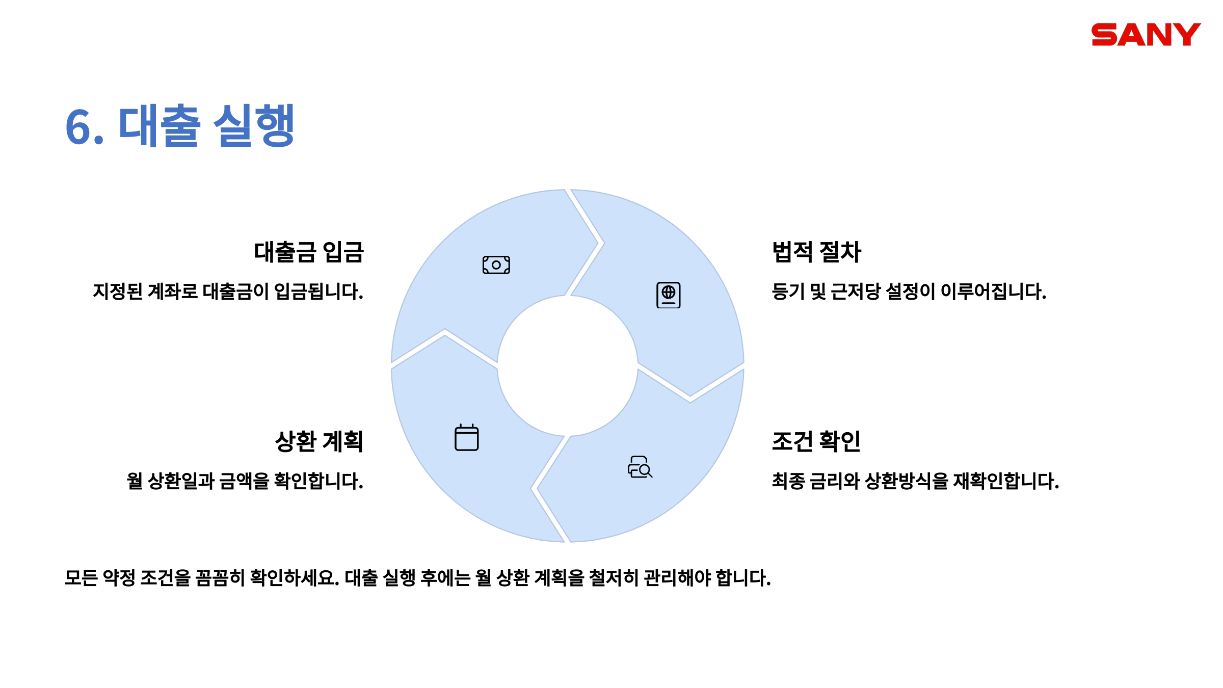 - 대출 계약서의 내용을 꼼꼼히 확인합니다. (대출 금액, 금리, 상환 방식, 중도상환수수료 등)