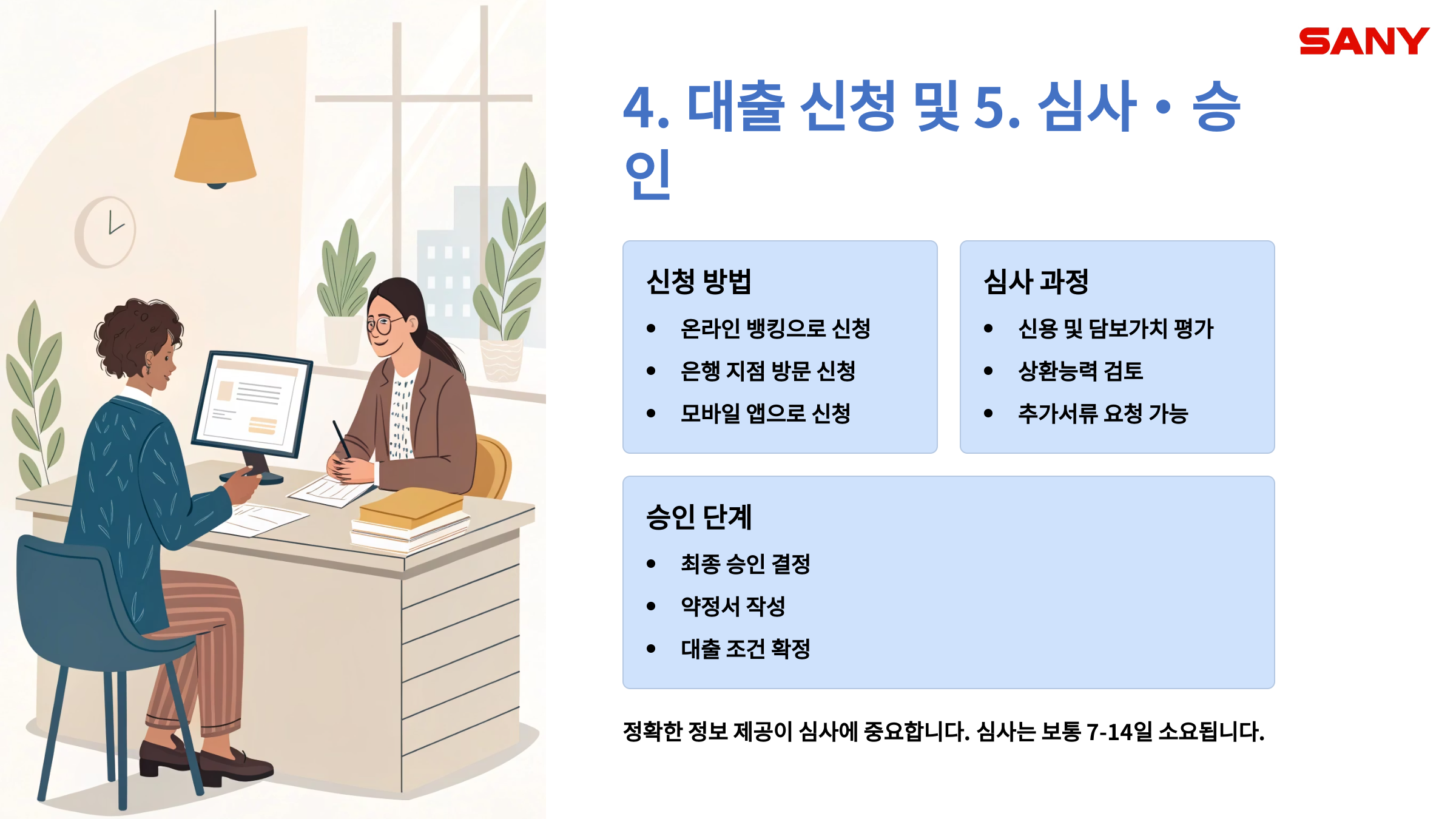 - 심사가 완료되면 대출 승인 여부와 최종 조건을 통보받게 됩니다.