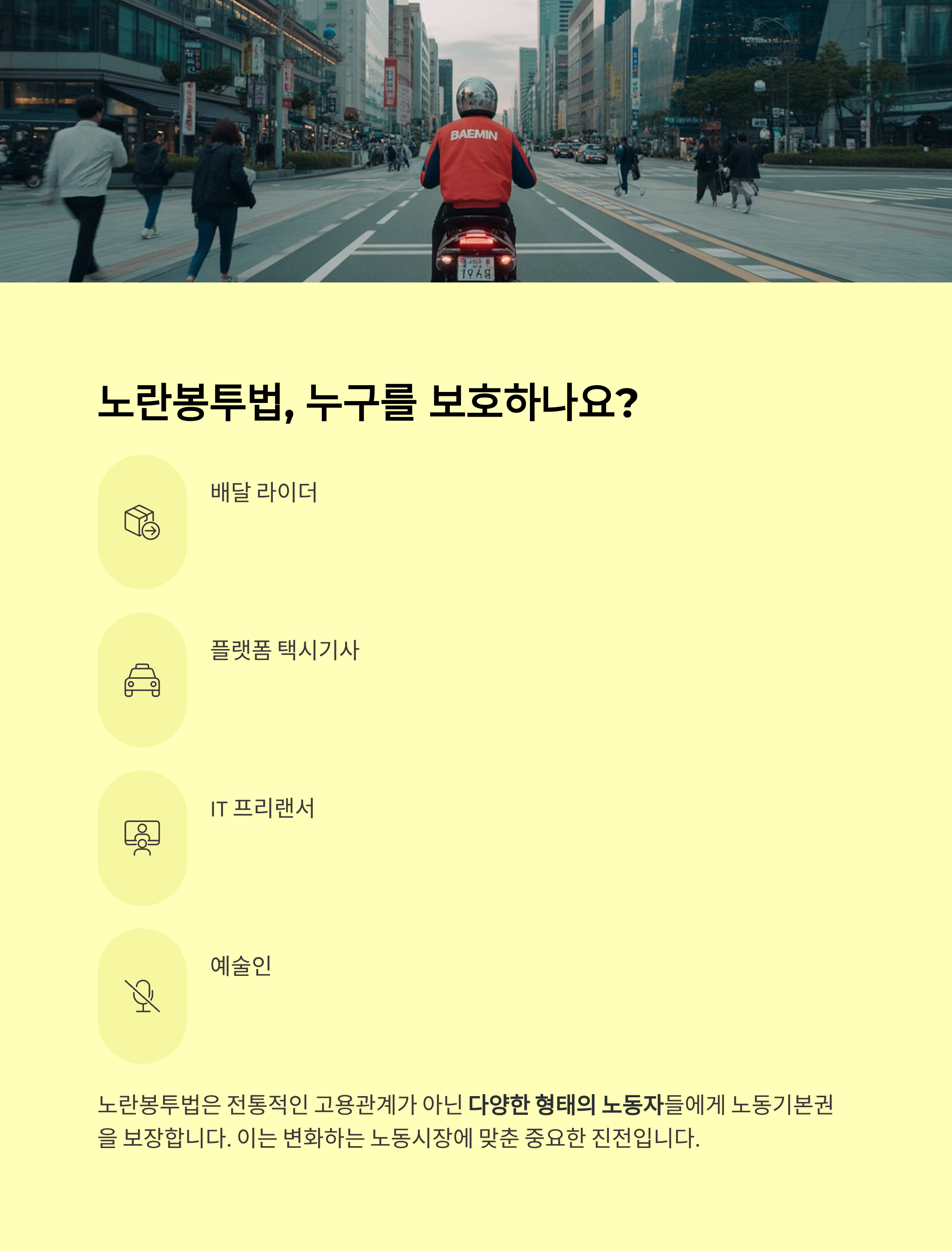 노란봉투법(노동조합법 개정안)은 특정 계층의 노동자들을 직접적으로 보호하고, 넓게는 모든 노동자의 권리 보장에 기여하고자 합니다.