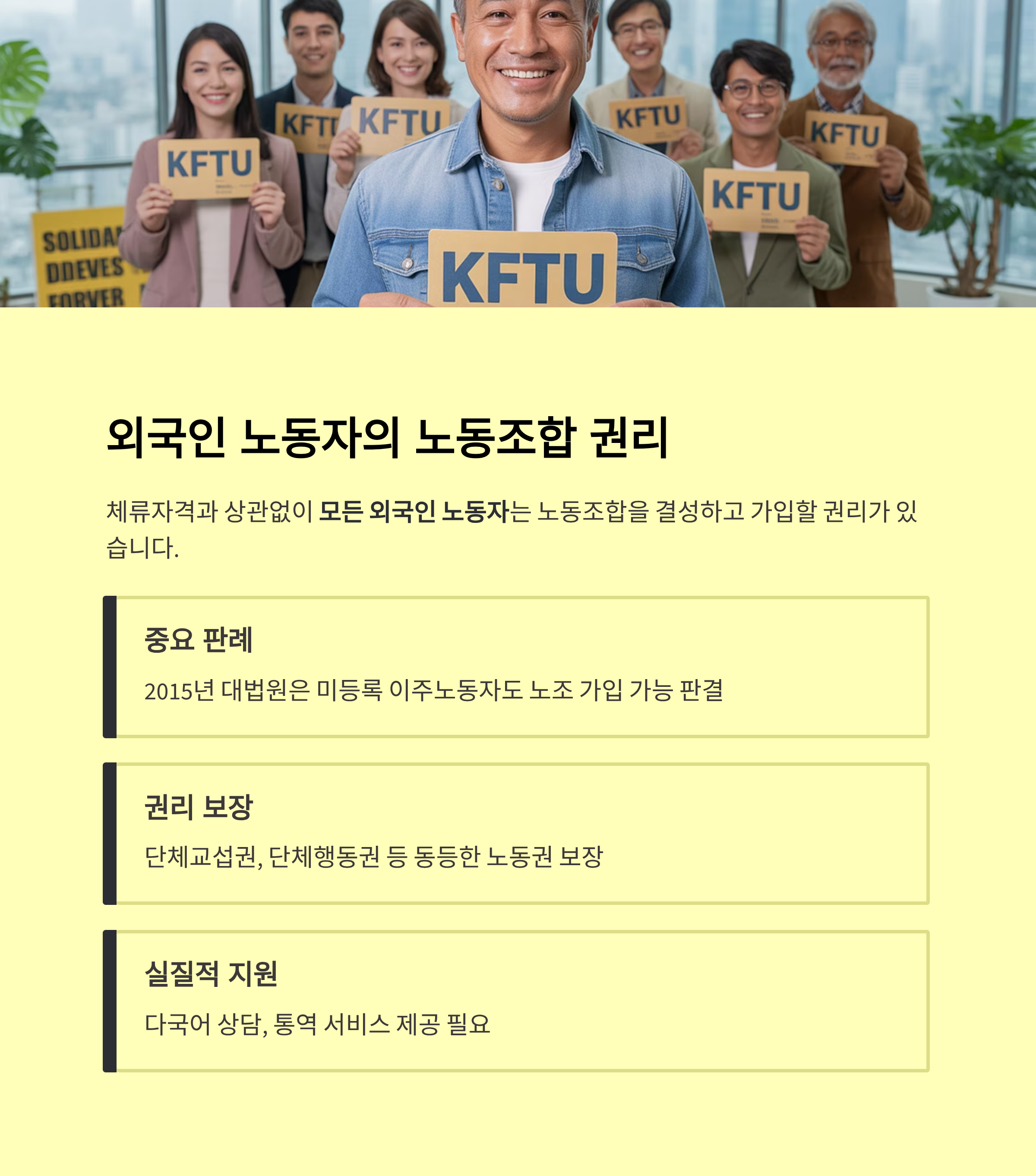 | 노동 3권 | 헌법, 노동조합법에 의해 국적 불문 보장 | 언어 장벽, 정보 부족, 불이익 우려 |