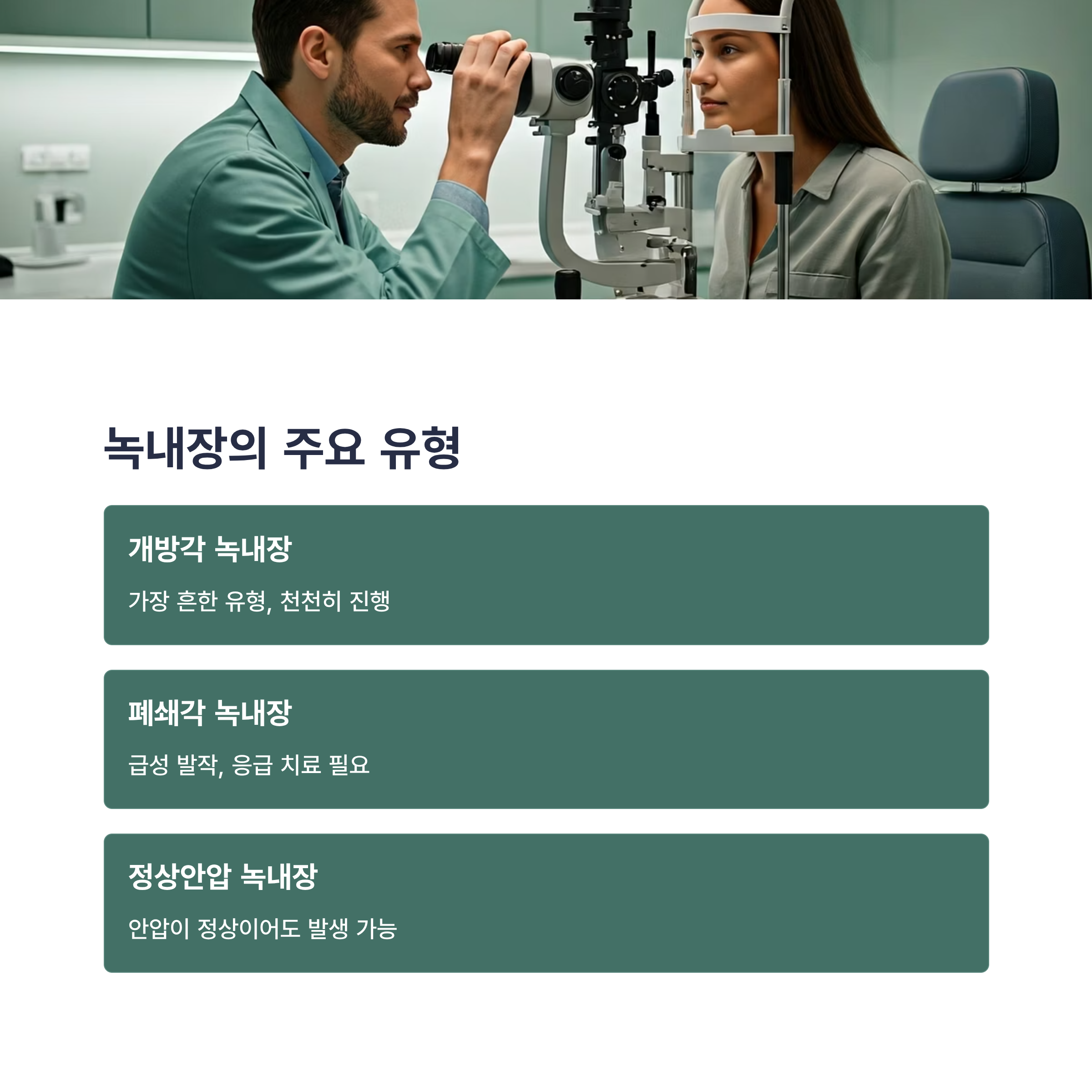 녹내장은 안압 상승이 가장 잘 알려진 원인이지만, 안압 수준과 발병 기전에 따라 여러 유형으로 나뉩니다. 각 유형별 특징을 이해하는 것이 중요해요.