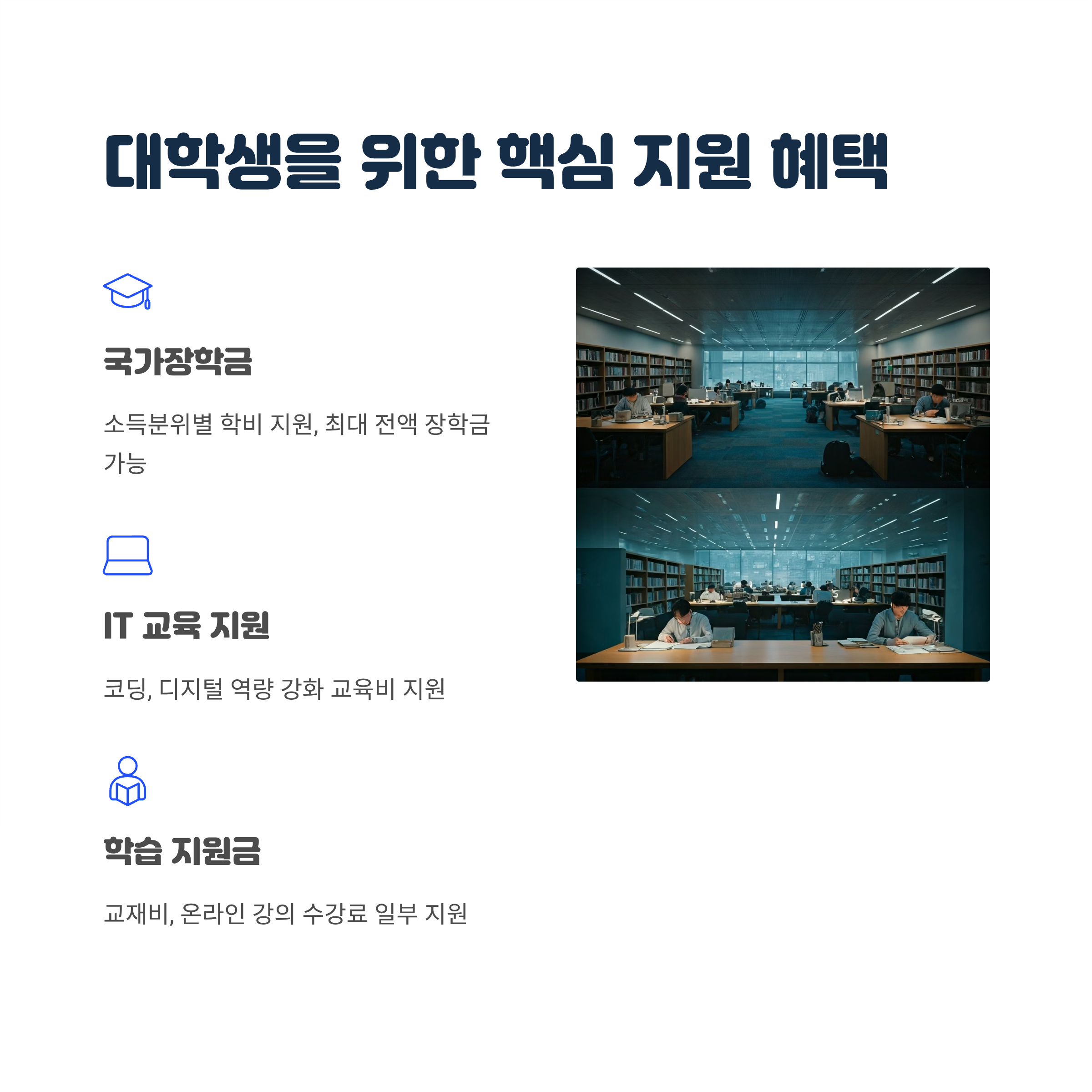 대학생 시절은 학업만으로도 벅찬데 등록금과 생활비 부담까지 만만치 않죠. 다행히 대학생을 위한 맞춤형 지원 제도가 잘 마련되어 있습니다. 가장 대표적인 혜택들을 소개할게요.
