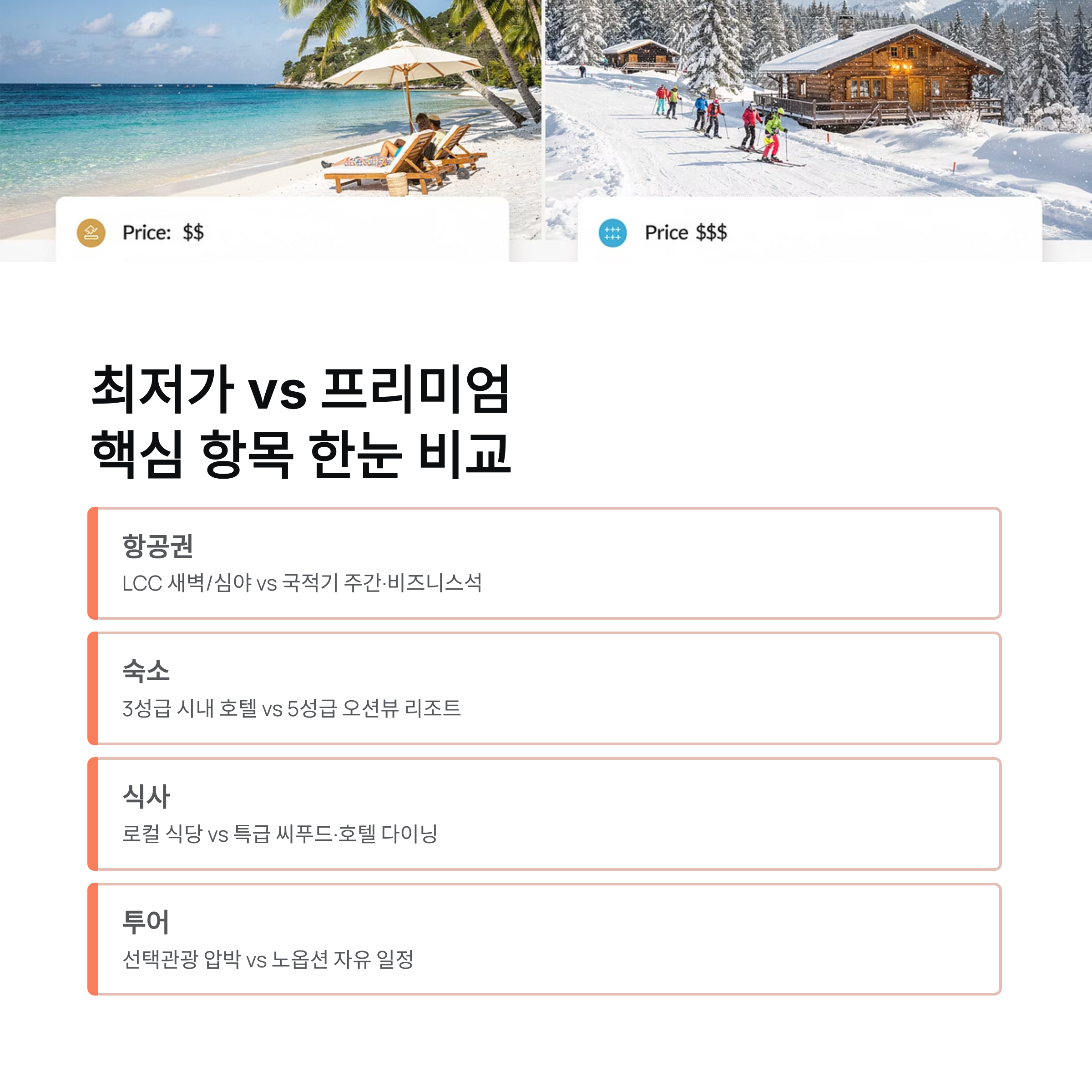 | 비교 항목 | 💚 최저가 (1인 40~60만 원대) | 🏆 프리미엄 (1인 120~200만 원+) |