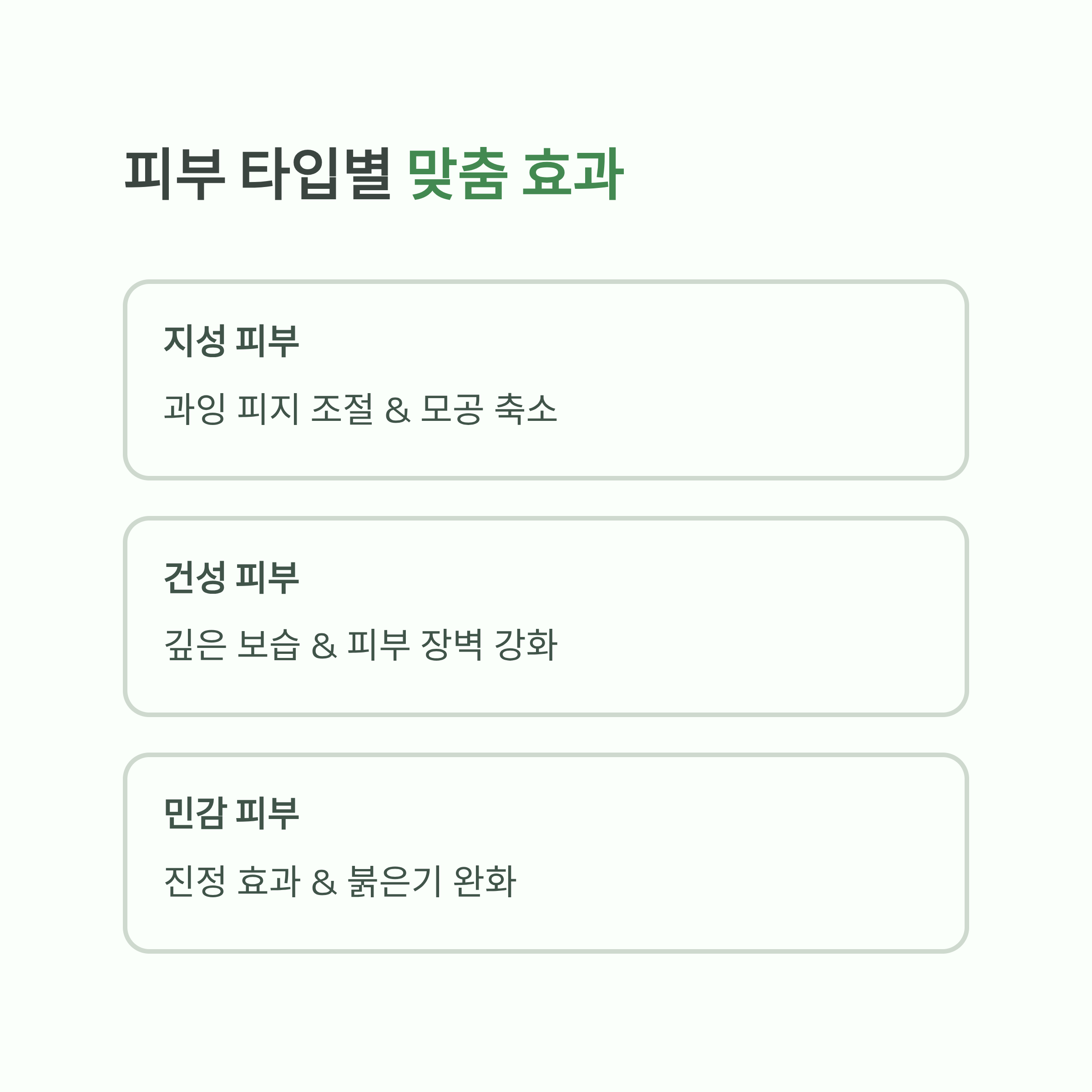 | 민감성 피부 | 자극에 취약한 피부, 트러블 피부 | 사용 시간 조절 (짧게), 다른 재료 믹스 (진정용) |