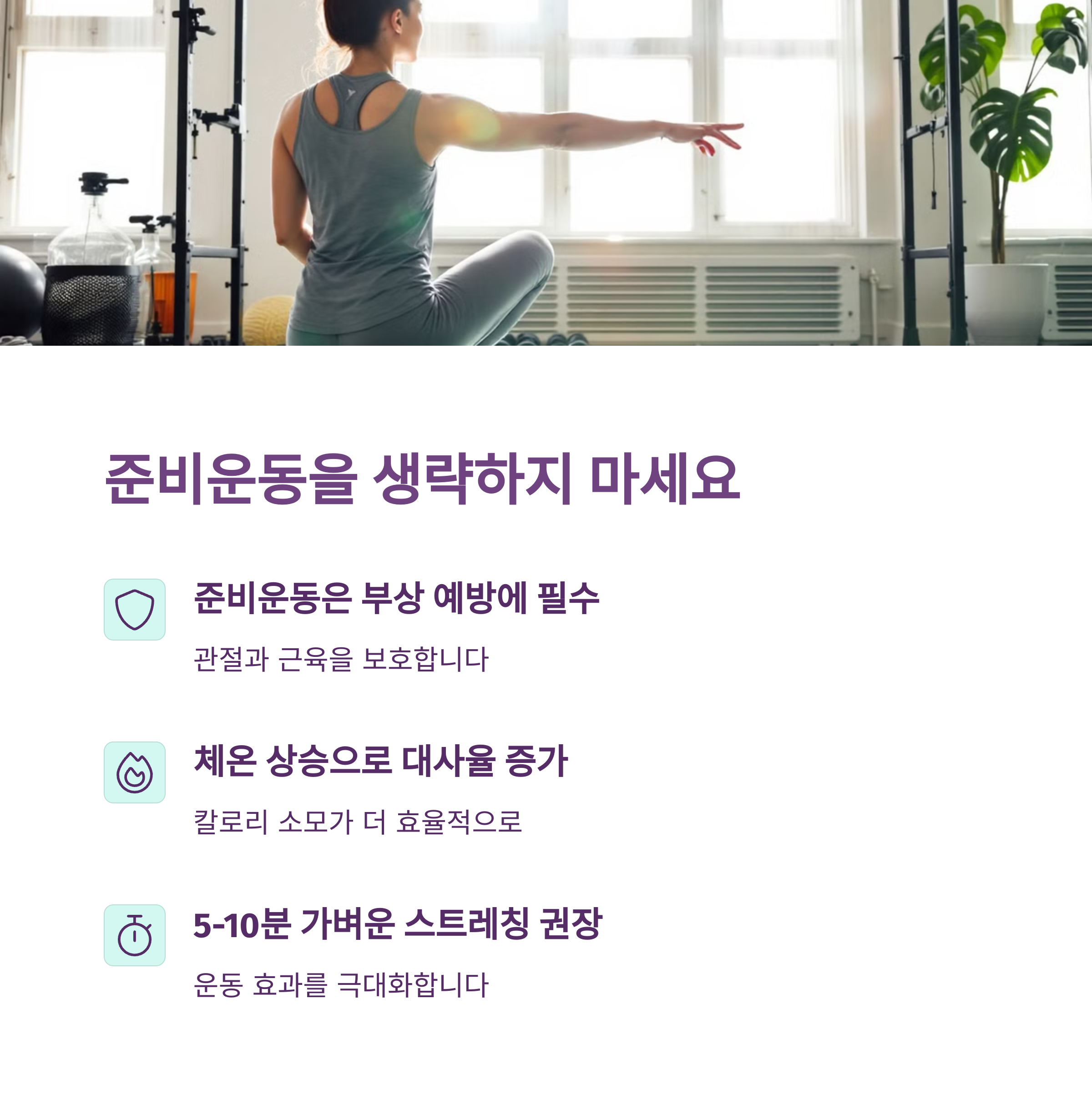 | 준비 운동 생략 | 체온 상승 없이 운동하면 부상 위험이 커집니다. |