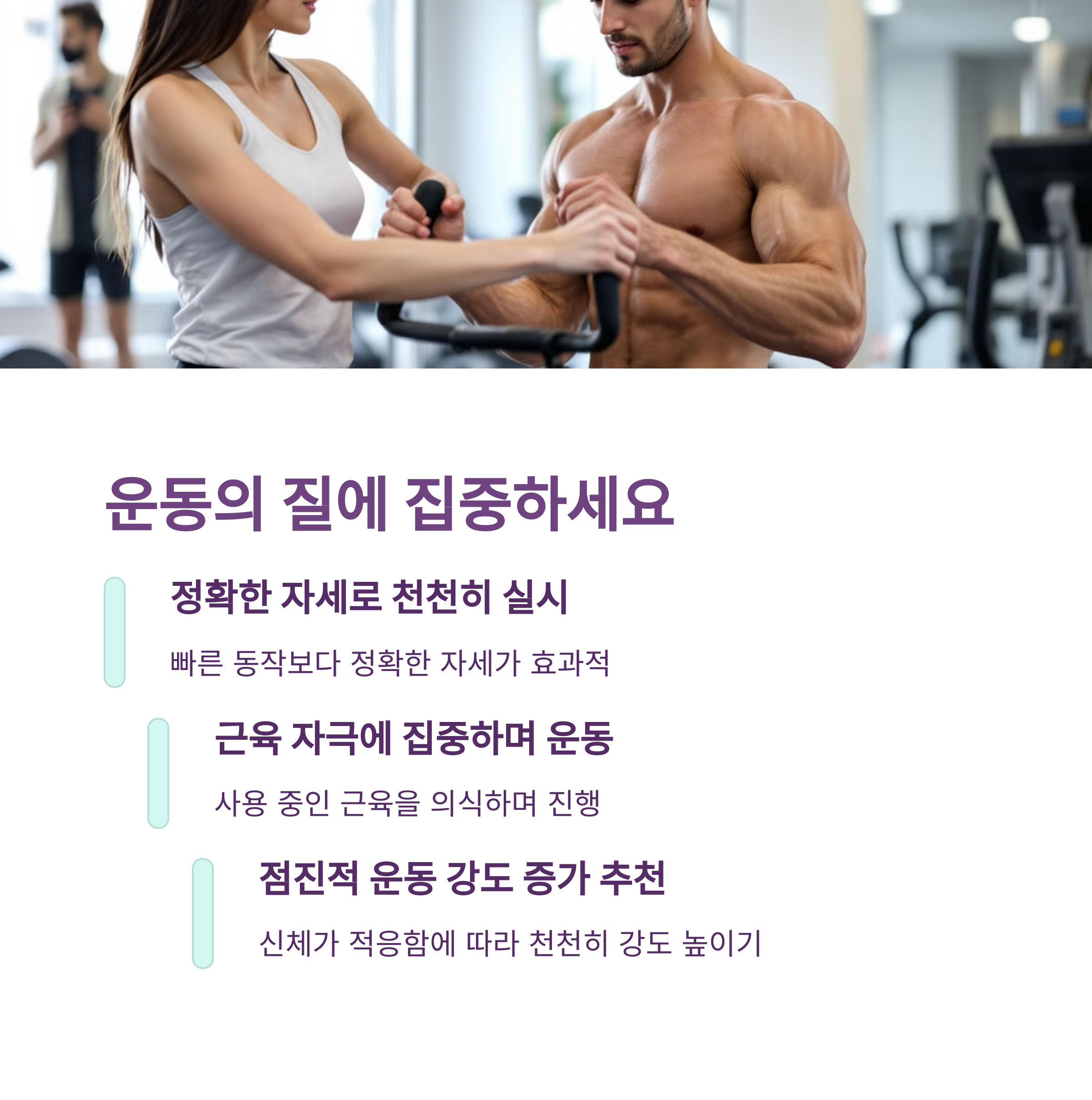 | 준비운동 생략, 과도한 운동 시간 | 관절 무리, 근육 경직 | 개인에 맞는 루틴, 꾸준한 실행 |