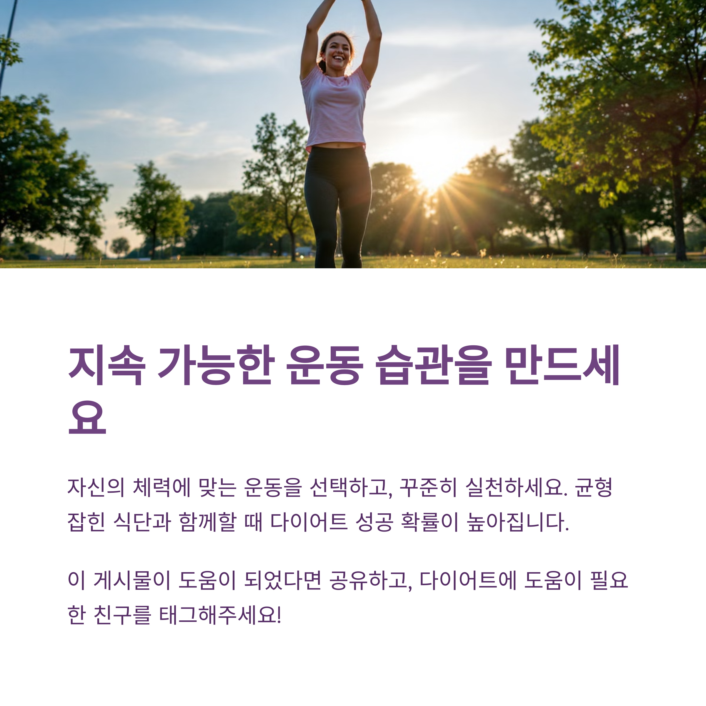 운동에서 가장 중요한 것은 지속 가능성입니다. 단기간에 무리하게 몰아붙이는 방식보다는, 즐겁고 꾸준히 할 수 있는 운동을 선택하는 것이 장기적으로 더 효과적입니다. 또한 충분한 수면과 영양 섭취가 병행되어야 운동 효과가 극대화됩니다. 몸에 귀 기울이며, 나에게 맞는 템포로 운동을 조절하는 습관이 결국 건강한 다이어트 성공으로 이어질 것입니다.