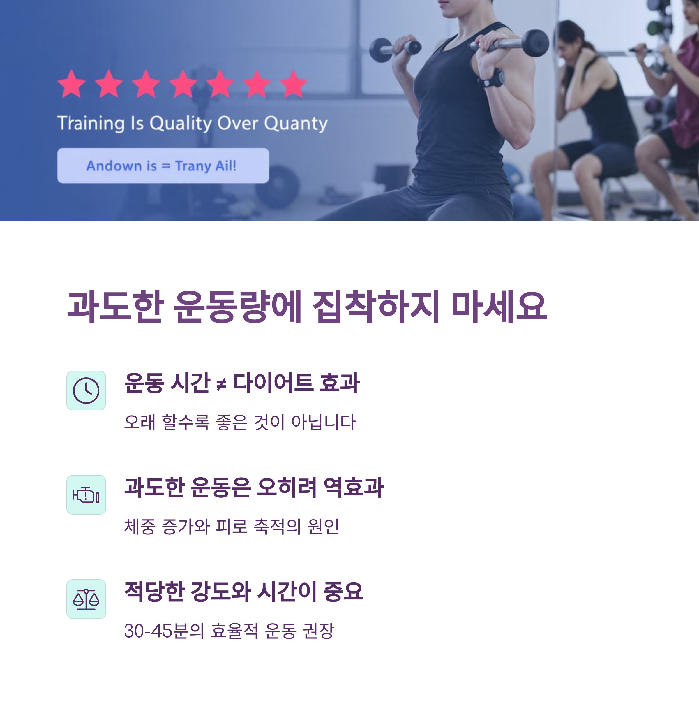 운동을 통해 체중을 감량하려는 사람들 중 많은 분들이 '더 많이, 더 오래' 운동하는 것이 정답이라고 생각합니다. 하지만 운동의 효과는 단순히 시간의 문제가 아닙니다. 오히려 운동량에 집착하다 보면 몸에 과도한 피로가 누적되어 다음 날의 컨디션이 저하되거나, 잦은 부상을 초래할 수 있습니다. 이는 장기적으로 운동을 지속하지 못하게 만들고, 결국 다이어트 실패로 이어질 가능성이 높아집니다. 효율적인 체중 감량을 위해서는 자신의 체력과 상태를 고려한 운동 루틴을 설계하는 것이 가장 중요합니다.