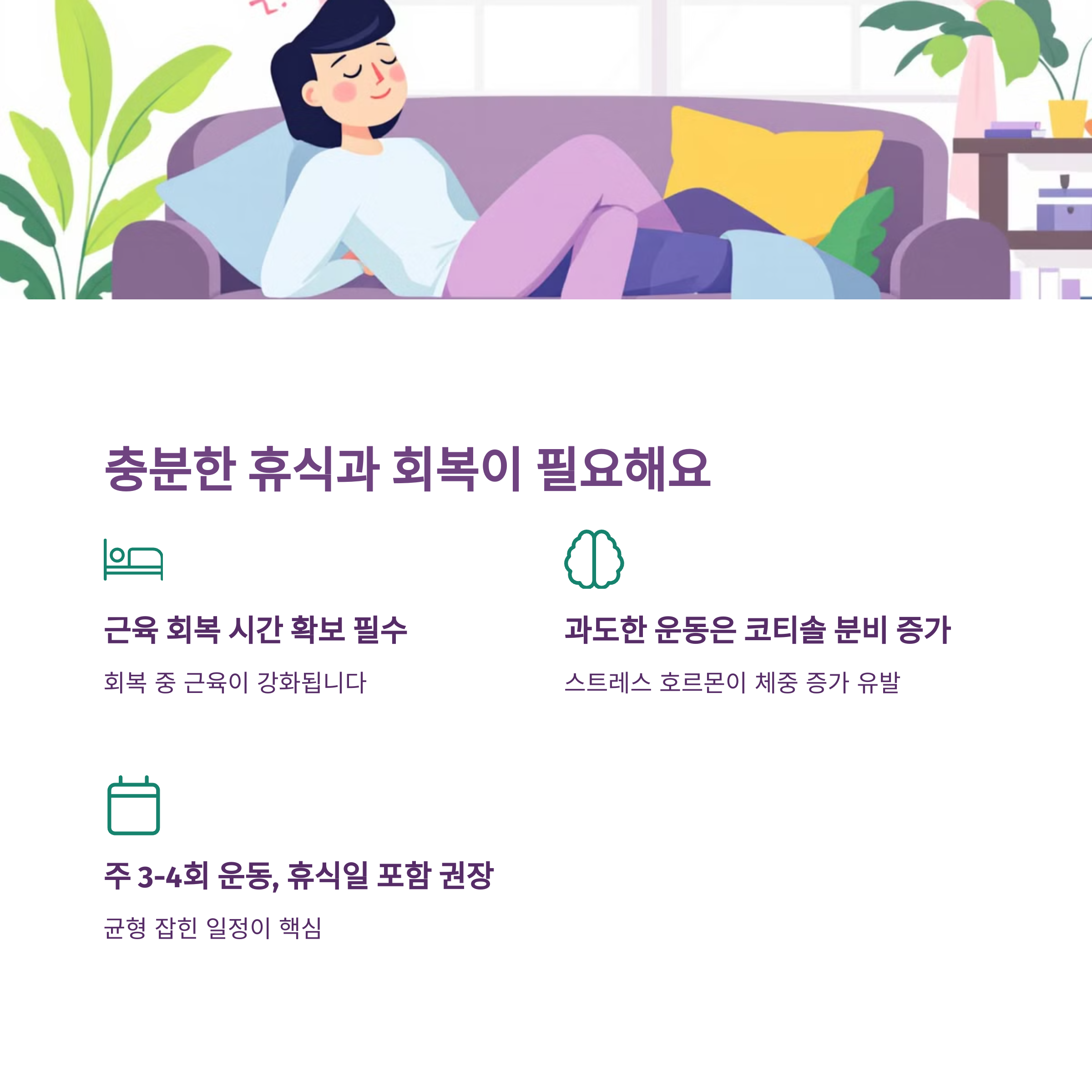 | 운동 후 스트레칭 미흡 | 회복력 저하, 반복 부상 | 수면, 식단, 휴식 포함한 균형 유지 |