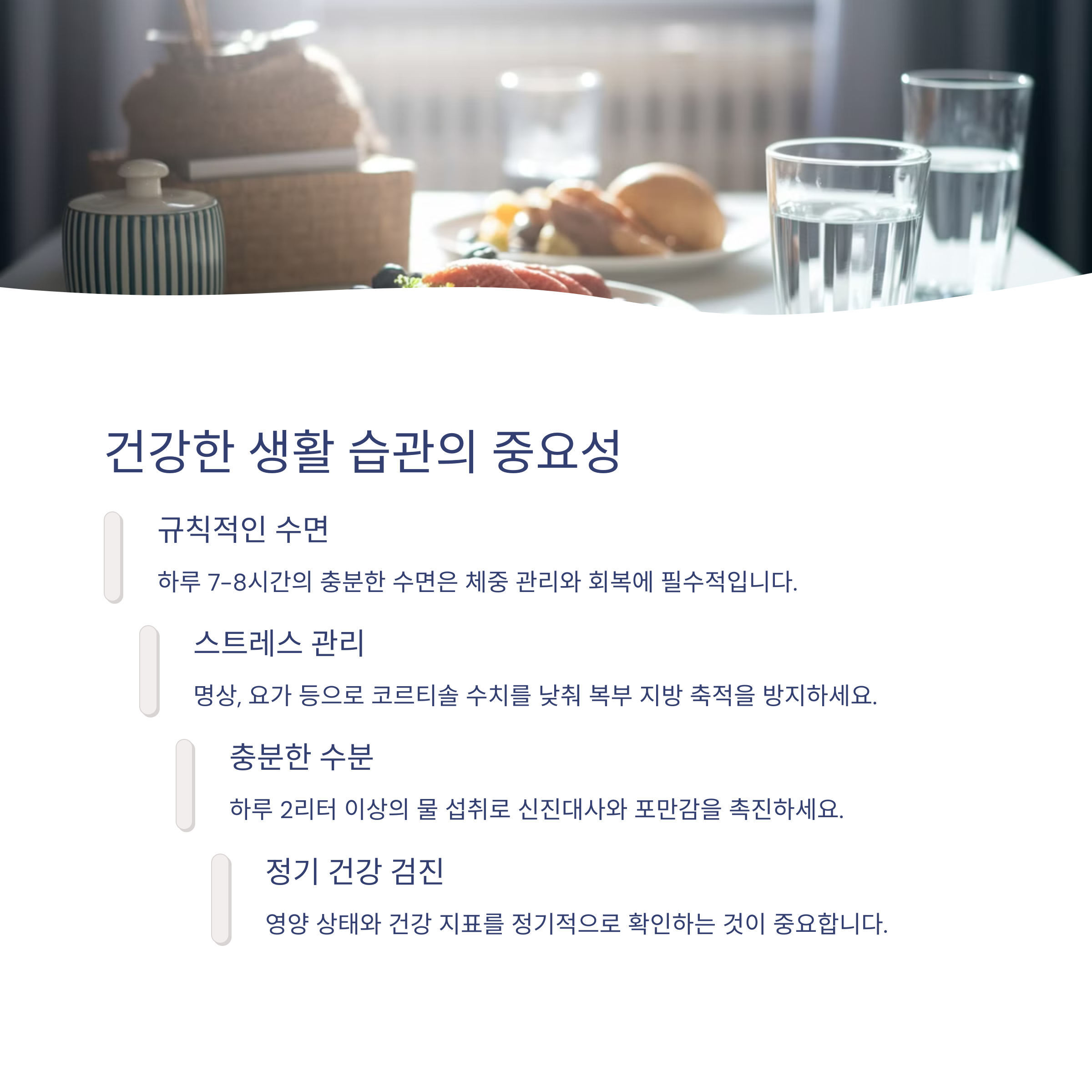 식단 조절도 운동만큼이나 중요합니다. 칼로리 섭취량을 조절하는 것은 기본이며, 단백질과 건강한 지방, 복합 탄수화물을 균형 있게 섭취해야 합니다. 예를 들어, 닭가슴살과 생선, 견과류 등은 단백질과 건강한 지방을 제공하며, 고구마와 현미 같은 복합 탄수화물은 지속적인 에너지를 공급합니다. 극단적인 저칼로리 다이어트는 오히려 요요 현상을 유발할 수 있으므로 피해야 합니다.