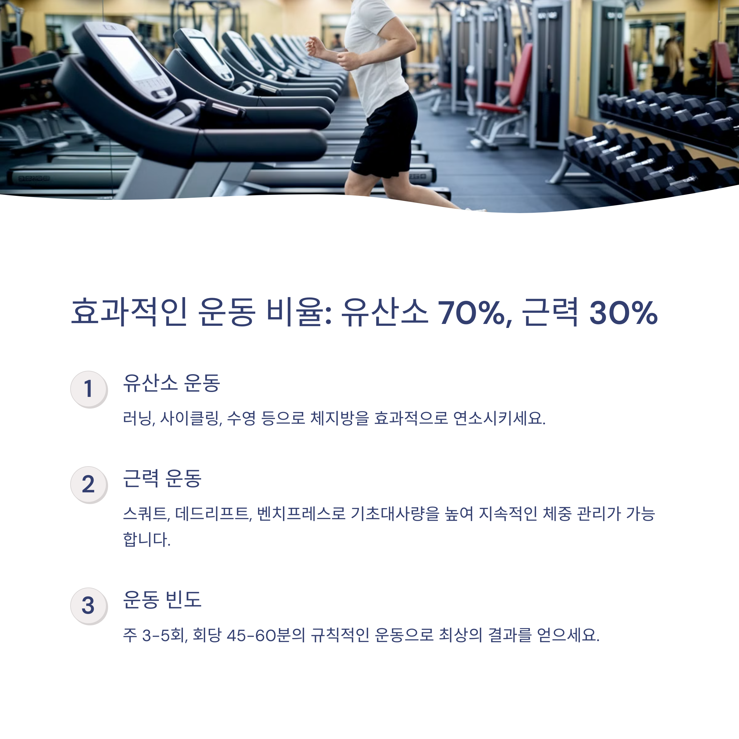 유산소 운동과 근력 운동을 병행하는 것이 가장 효과적입니다. 체지방을 줄이기 위해서는 러닝, 사이클 같은 유산소 운동을 추천하며, 기초대사량을 높이기 위해 스쿼트, 데드리프트 같은 근력 운동이 중요합니다.