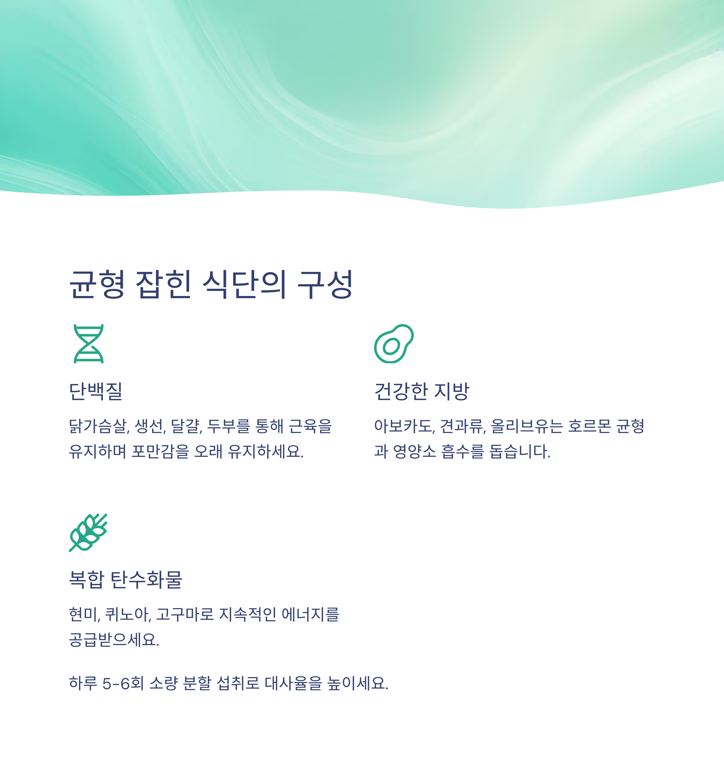 | 지방 연소, 심폐 지구력 향상 | 근육량 증가, 기초대사량 상승 | 균형 잡힌 영양 섭취 |