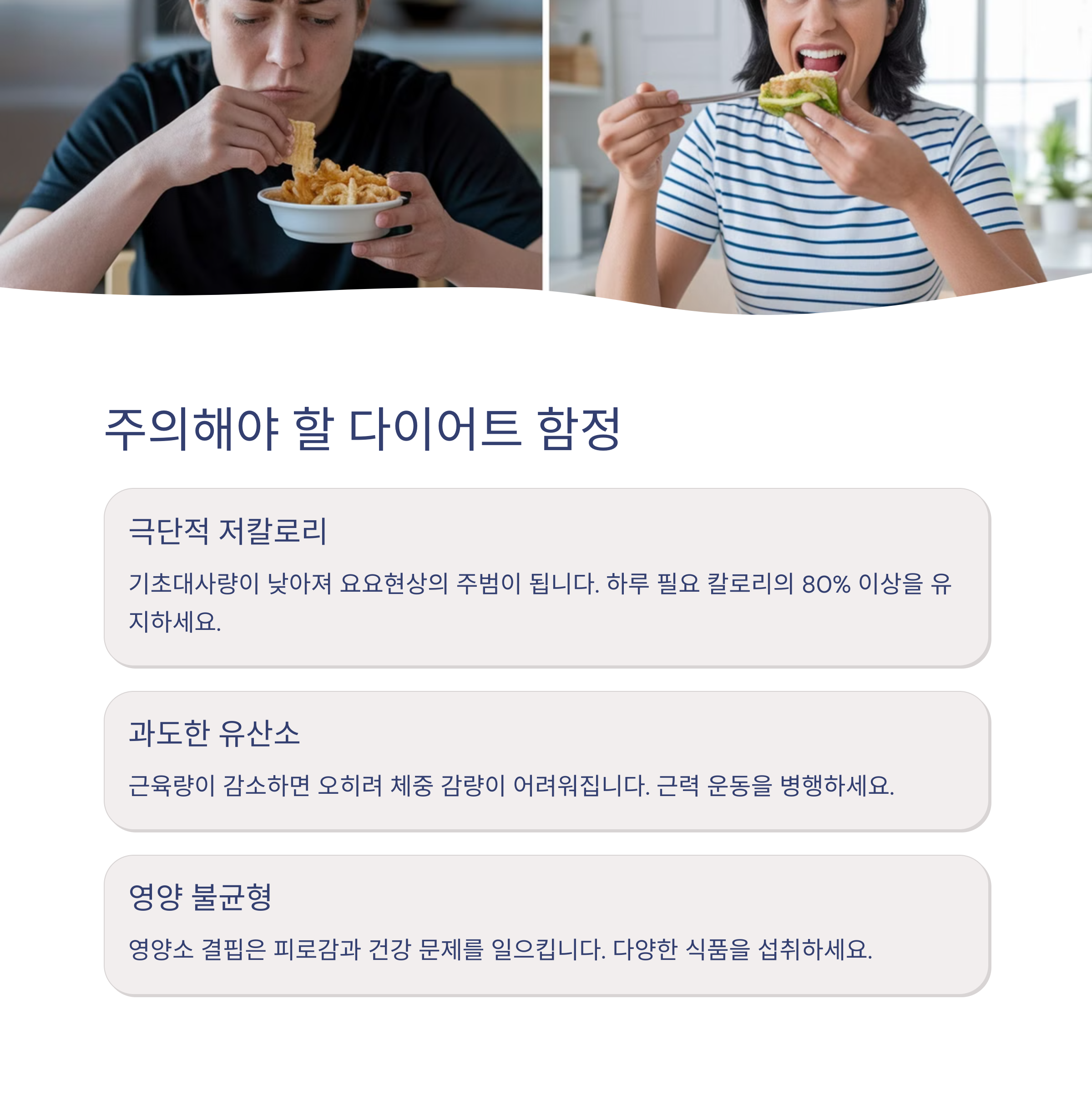 무리한 저칼로리 다이어트는 요요 현상을 초래할 수 있습니다. 천천히 감량하고, 단백질 섭취와 꾸준한 운동을 유지하는 것이 중요합니다. 목표 달성 후에도 건강한 식단과 생활 습관을 유지해야 합니다.