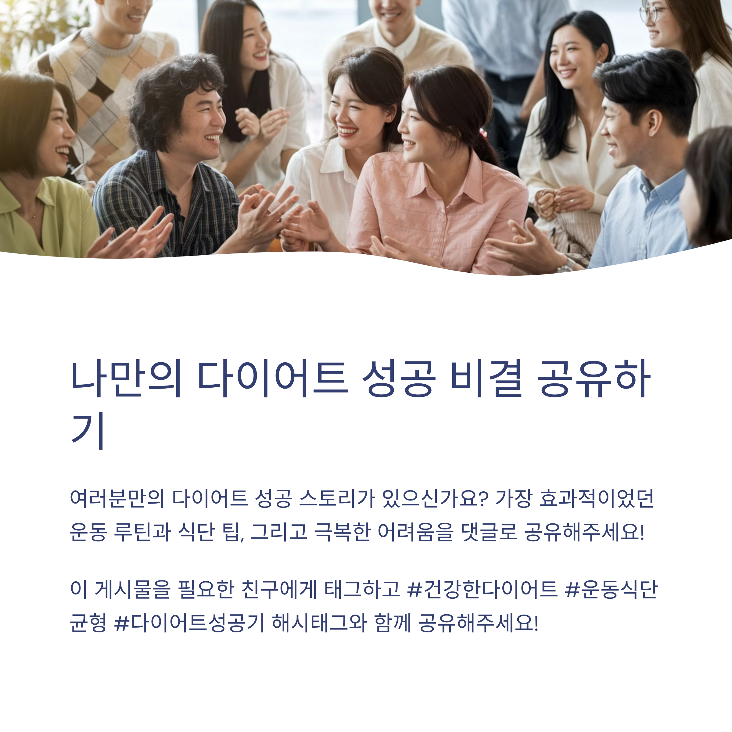 다이어트 성공을 위해 어떤 방법을 실천하고 계신가요? 여러분만의 운동 루틴이나 식단 팁을 댓글로 공유해 주세요!