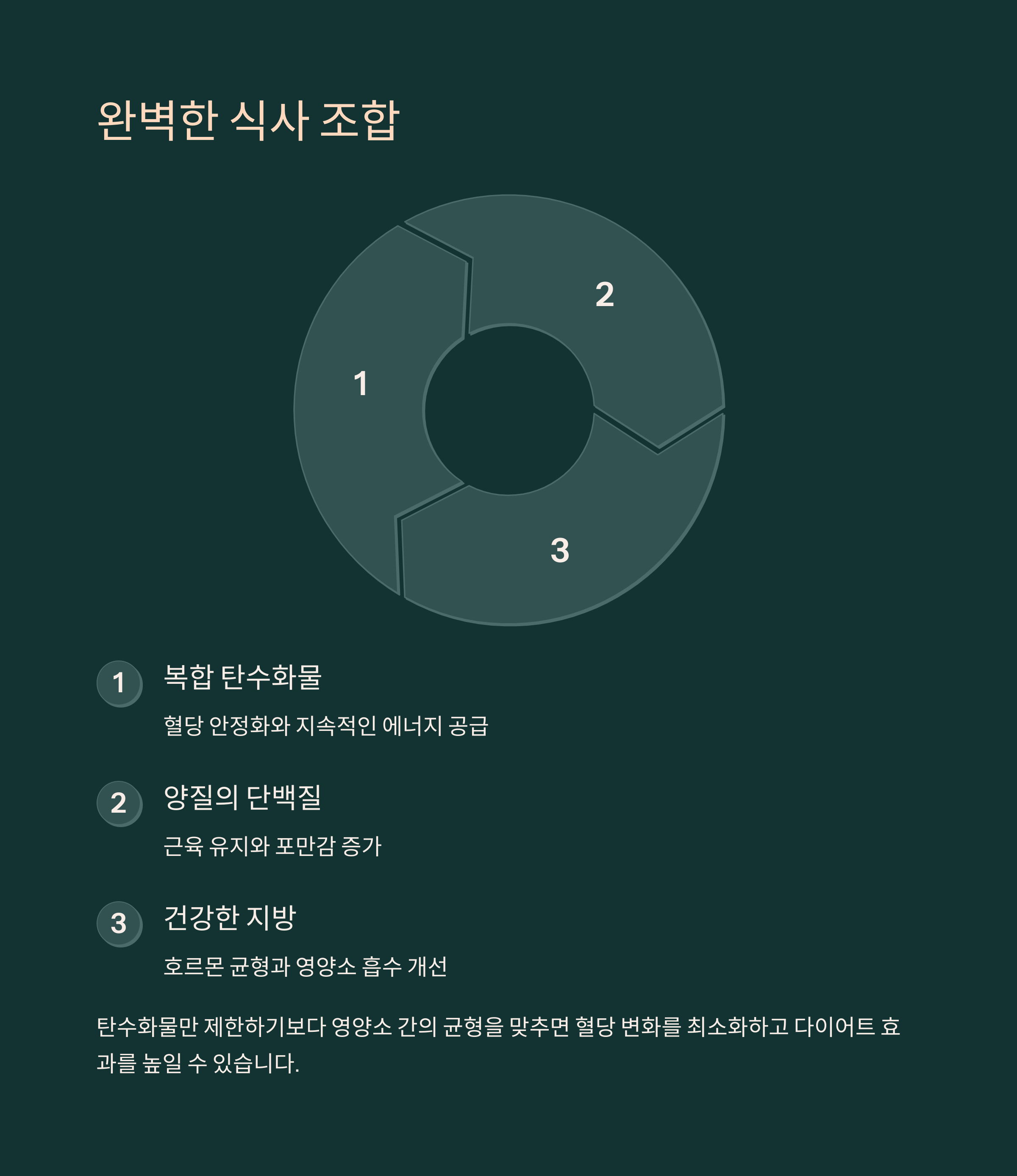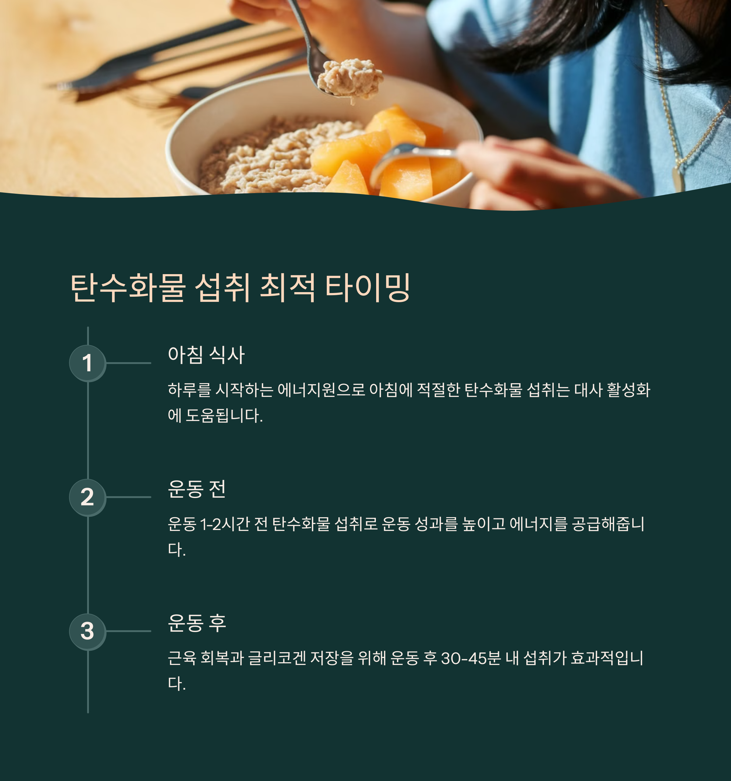 | 현미, 귀리, 퀴노아, 고구마 | 섬유질이 많고 소화 속도가 느린 곡물 | 귀리+견과류, 현미+닭가슴살 |