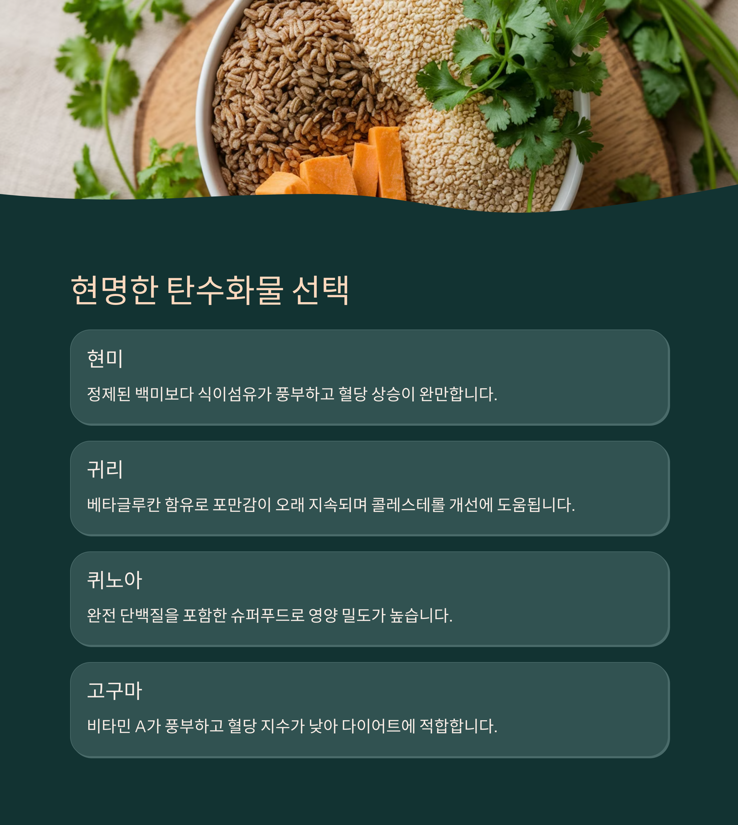 | 건강한 탄수화물이란? | 섬유질이 풍부하고 혈당을 천천히 올리는 탄수화물 |