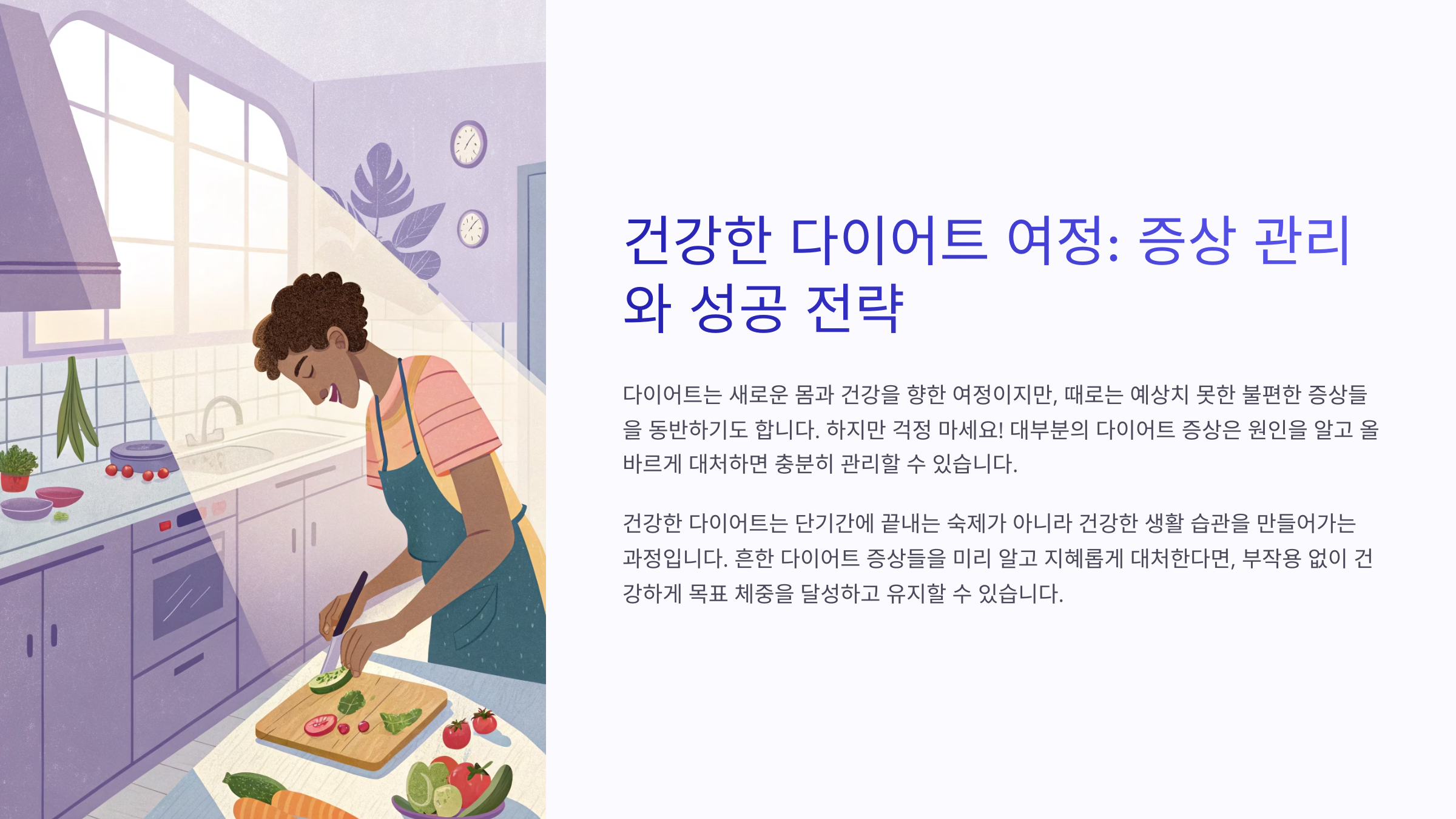 다이어트는 새로운 몸과 건강을 향한 여정이지만, 때로는 예상치 못한 불편한 증상들을 동반하기도 합니다. 하지만 걱정 마세요! 대부분의 다이어트 증상은 원인을 알고 올바르게 대처하면 충분히 관리할 수 있습니다. 이 글에서는 다이어트 중 흔히 겪게 되는 증상들과 그에 대한 효과적인 해결책을 구글 SEO에 최적화하여 상세히 알려드립니다. 건강한 다이어트 성공을 위한 필수 정보를 지금 바로 확인하세요!